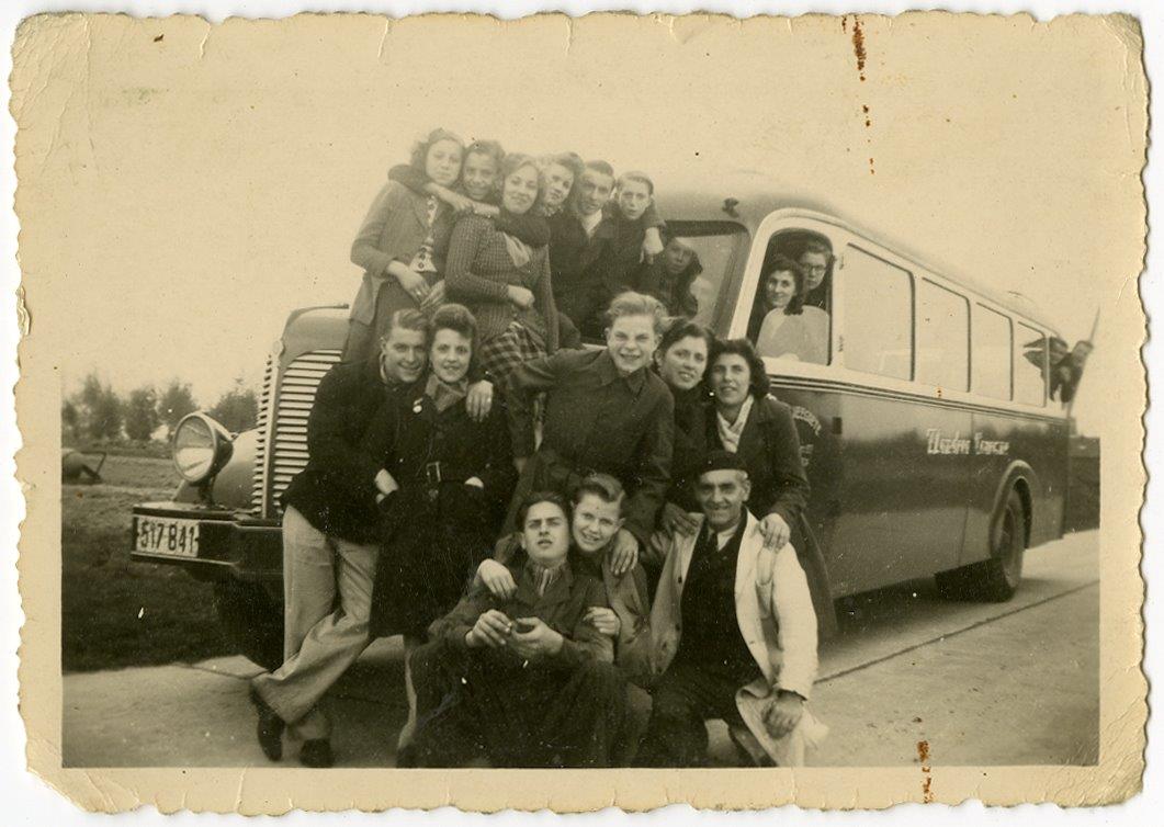 Groepsfoto van enkele werknemers bij de UCO-bus die hen onder andere van Oosterzele naar de fabriek in Gent brengt.