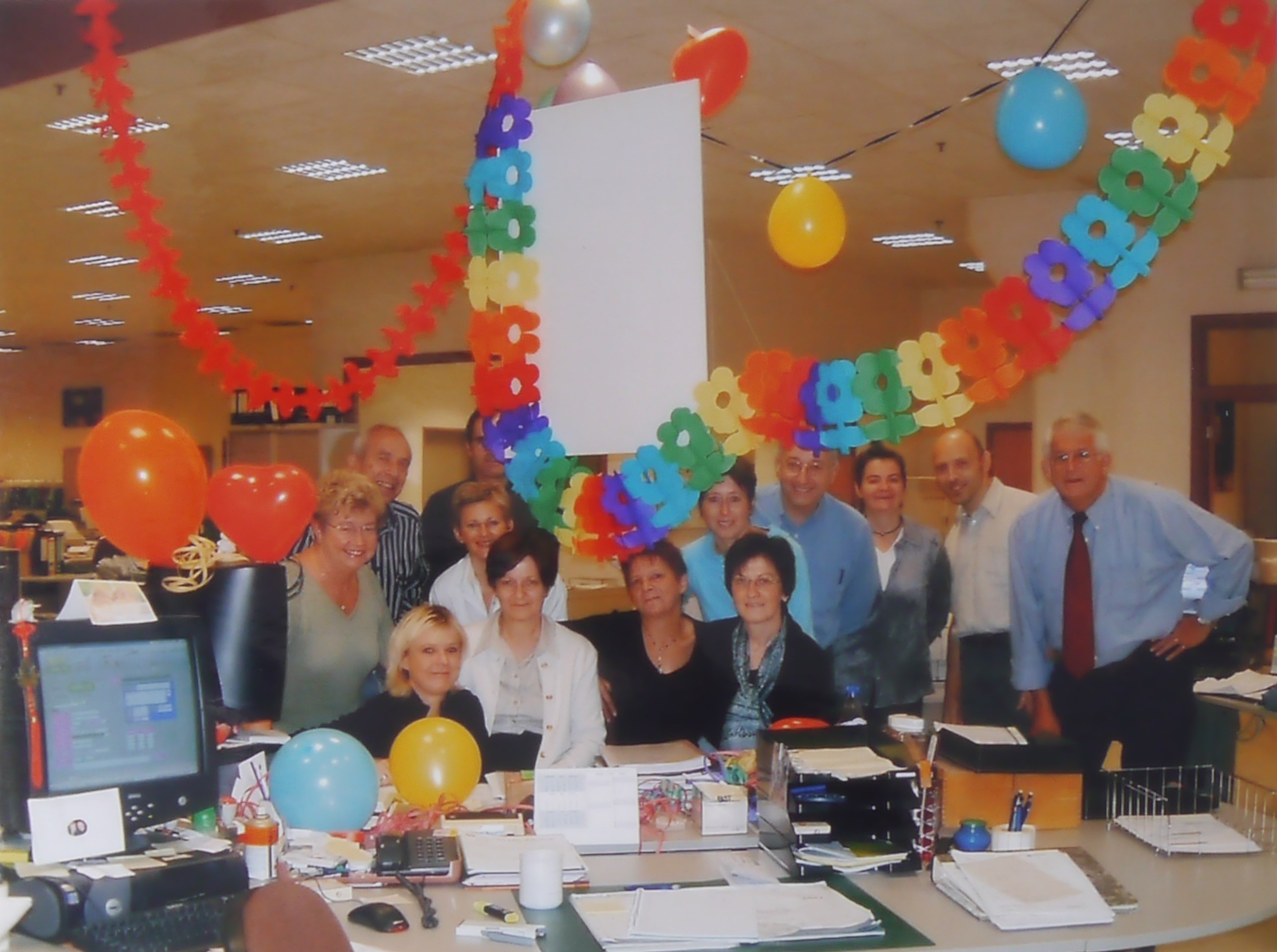 Personeelschef Paul (uiterst rechts) met zijn team, op het afscheidsfeest van een collega.