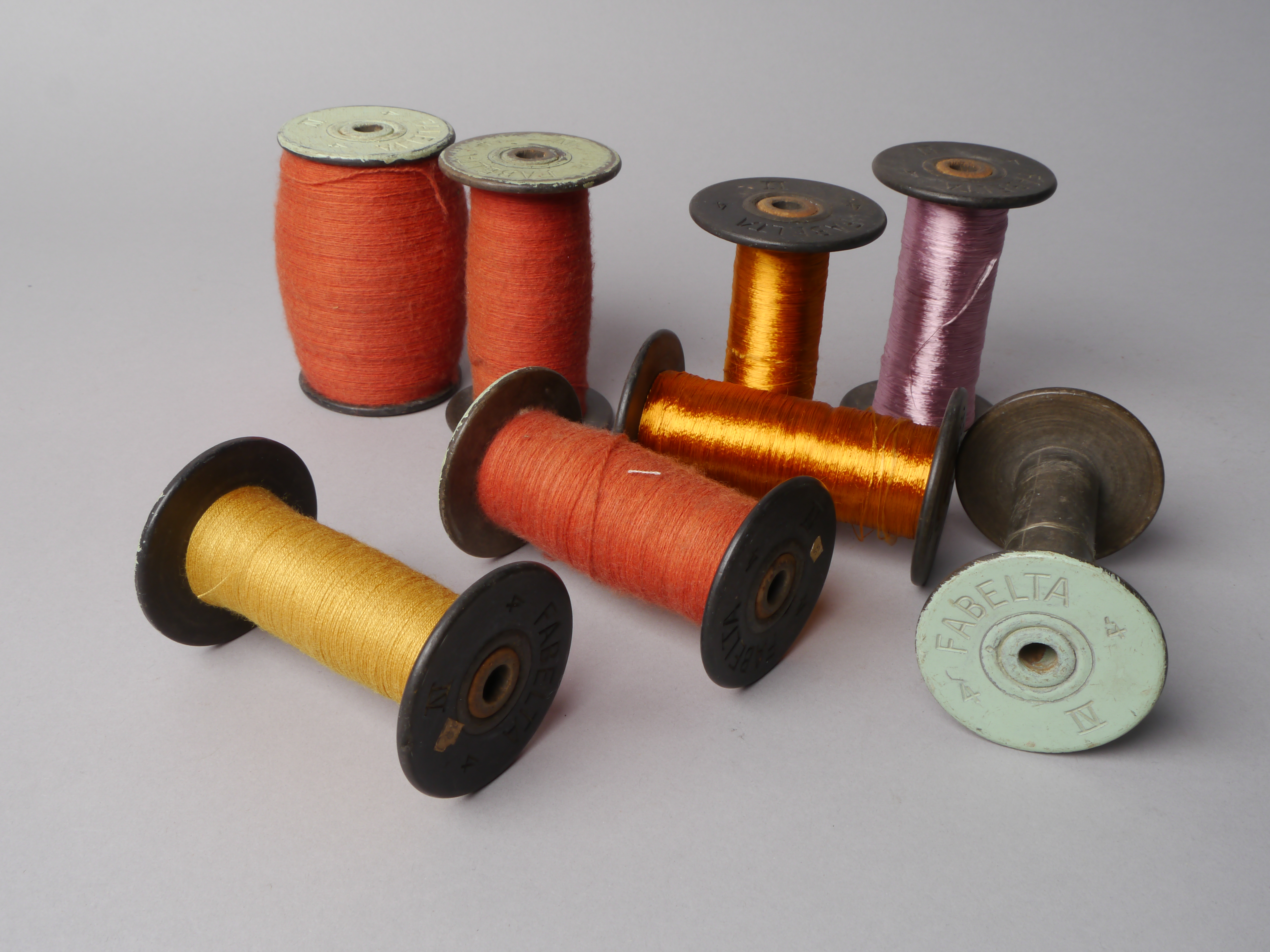 Garen voor passement in verschillende kleuren, op bobijnen van geperst karton van het merk Fabelta, 2de helft 20e eeuw.