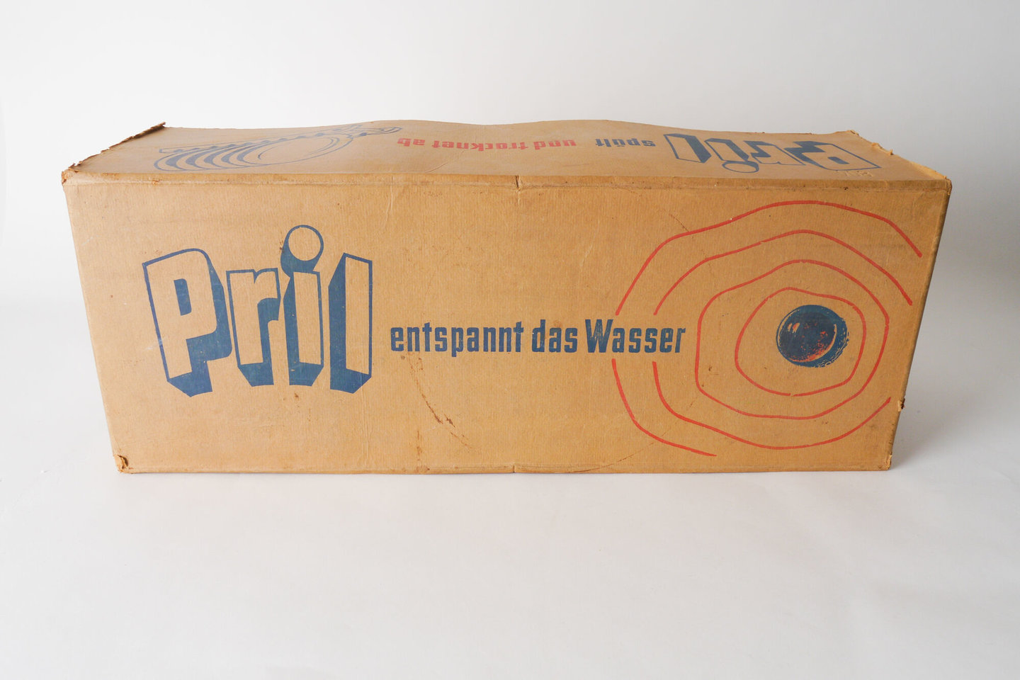 - opschriften: Pril / entspannt das Wasser // p 25 / Pril / 25 Doppelpakete / FEWA-WERK DÜSSELDORF // Pril / spezielle zum Spülen und Abwaschen / Trocken / lagern! // Pril spült und trcknet ab