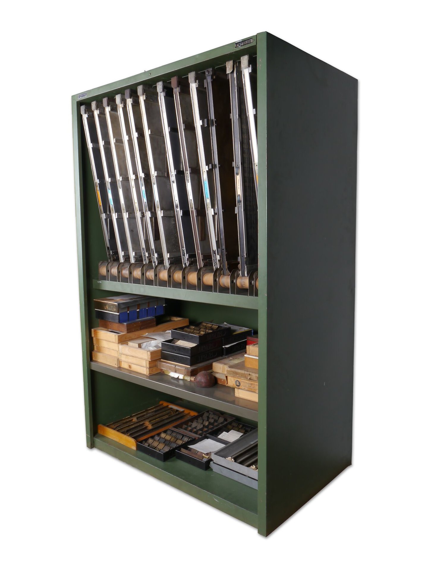 #metaal #zetterij #hoogdruk #drukkerij #20ste eeuw #Intertype Corporation #Société Linotype Belge SA #meubilair #matrijskast