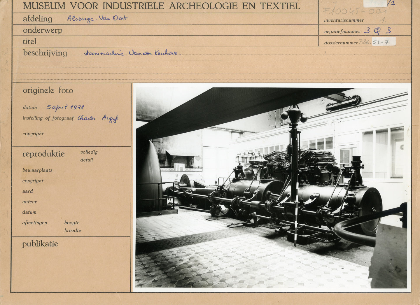 Inventarisfiche van een foto uit een reportage over de fabriek Alsberge-Van Oost door Charles Argyl, 1978. Collectie Industriemuseum.