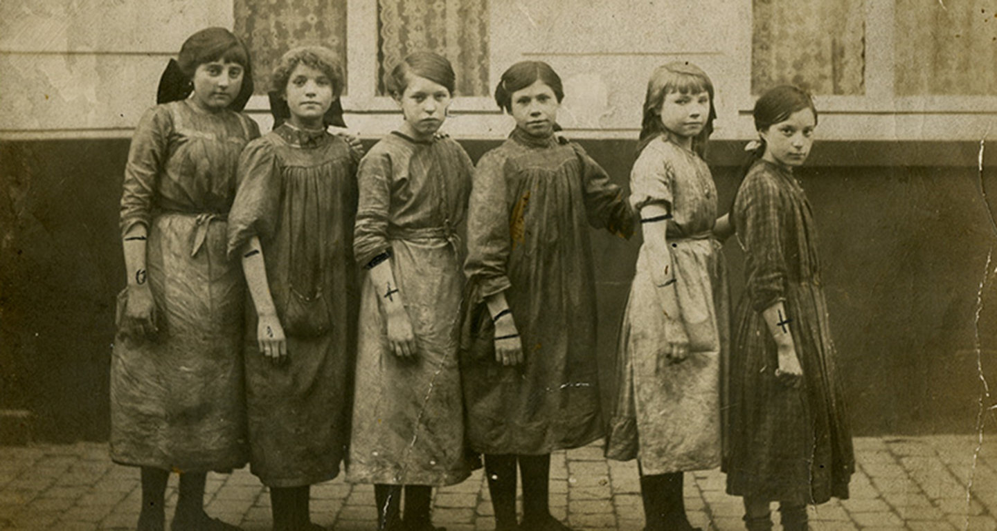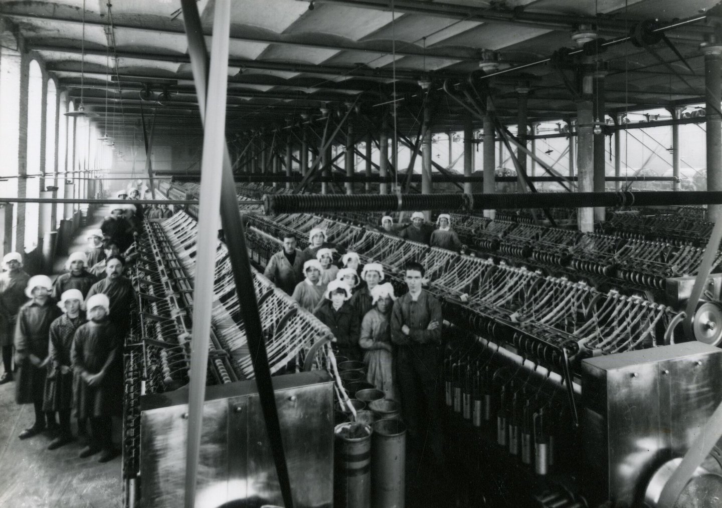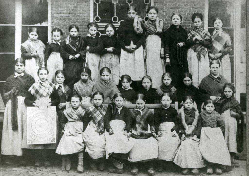 Strengenmaaksters en sorteerders, waaronder kinderen van 8 jaar, in 1868. Groepsfoto genomen in de fabriek J.B. Jelie, Aalst. © AMSAB-ISG