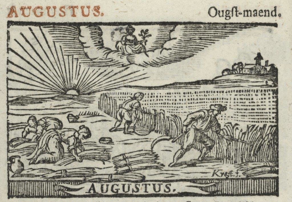 Prent Augustus, oogstmaand, Gent, 1720 uit ‘Den onvervalschten Vlameschen tydtwyser’. © Universiteitsbibliotheek Gent