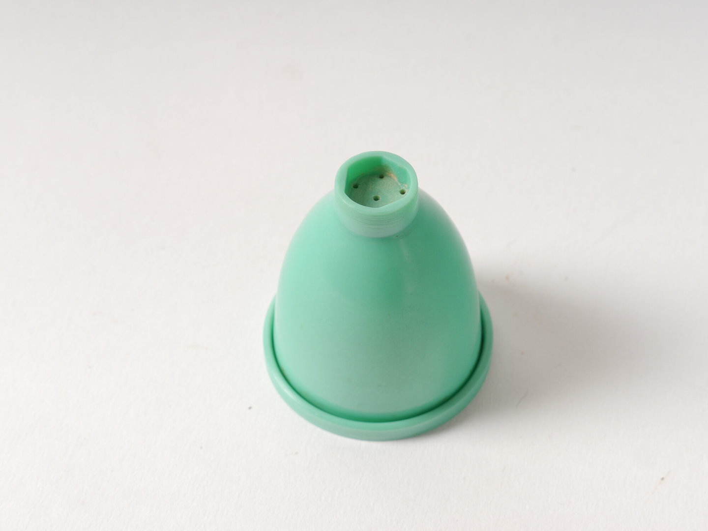 Pepervat geperst uit groene kunststof, vermoedelijk melamine of ureumformaldehyde.