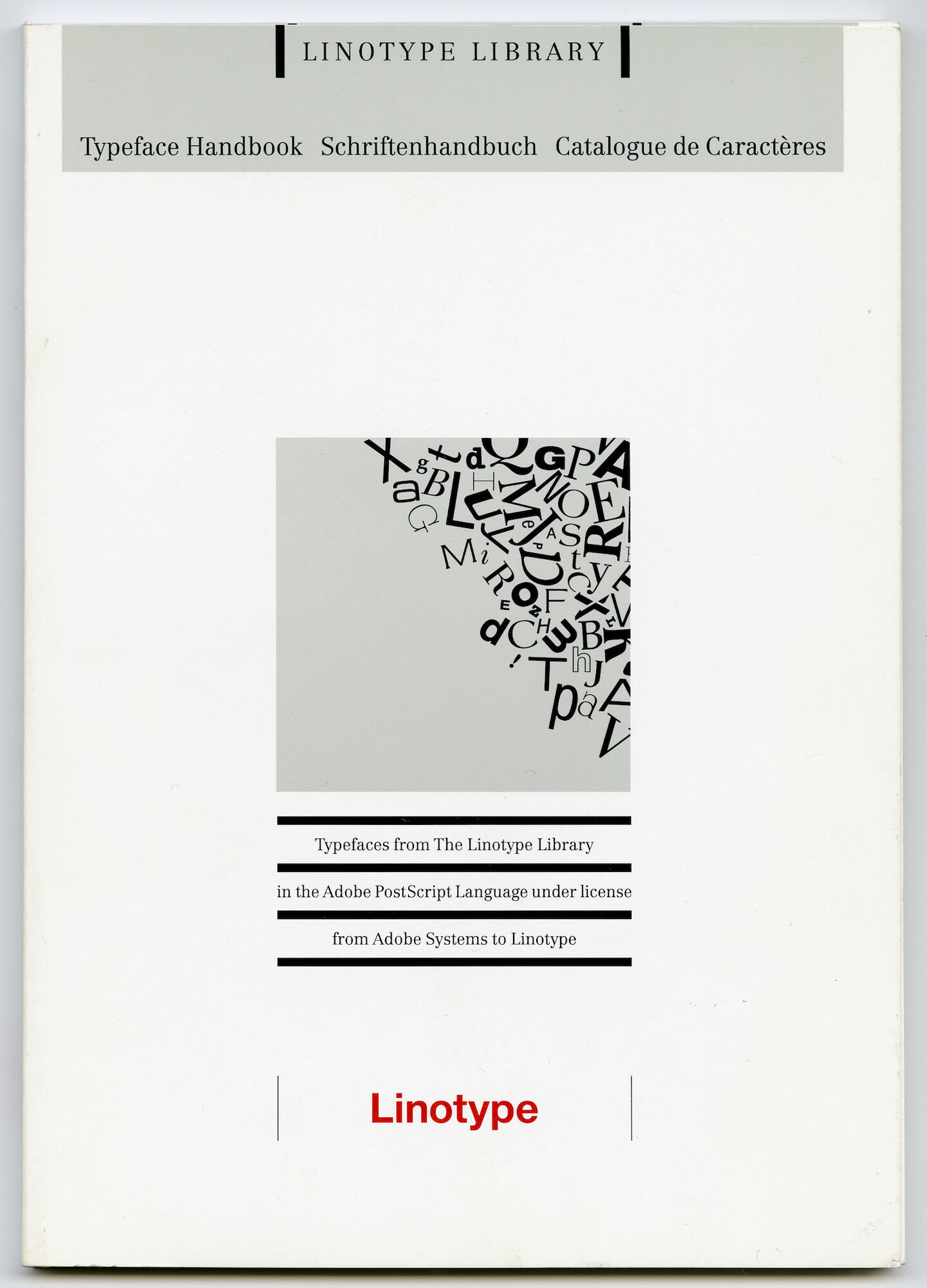 - opschriften: Linotype Library / Typeface Handbook Schriftenhandbuch Catalogue de Caractères / Typefaces from the Linotype Library in the Adobe PostScript Language under license from Adobe Systems to Linotype