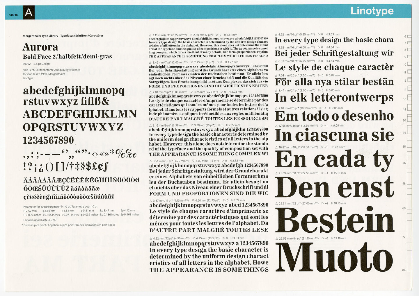 - opschriften: Mergenthaler Type Library Typefaces / Aurora / Bold Face 2 / 69002 8.5 pt Design / Slab Serif / Jason Burke 1960, Mergenthaler Linotype