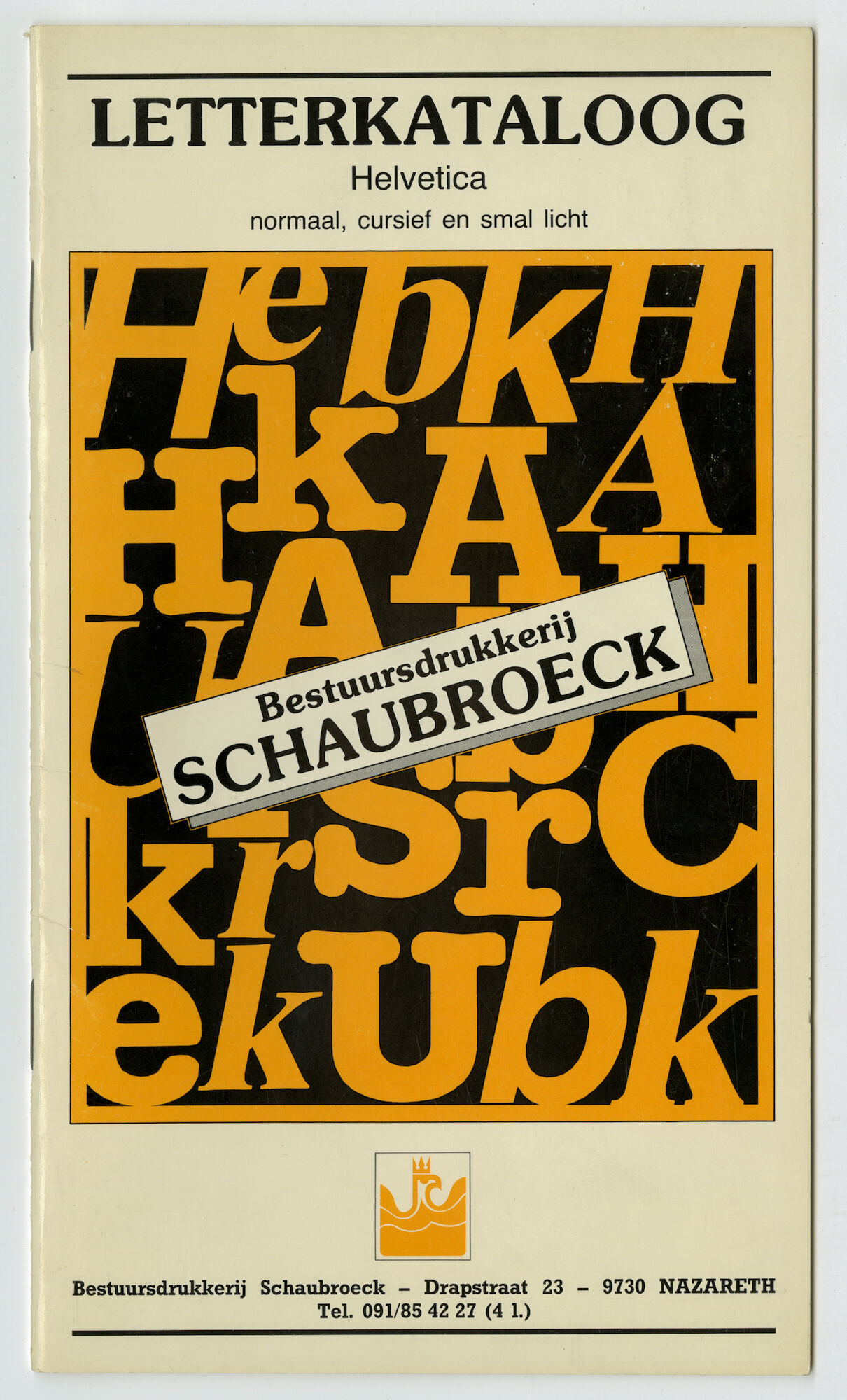 - opschriften: Letterkataloog Helvetica / normaal, cursief en smal licht / Bestuursdrukkerij Schaubroeck / Drapstraat 23, 9730 Nazareth
