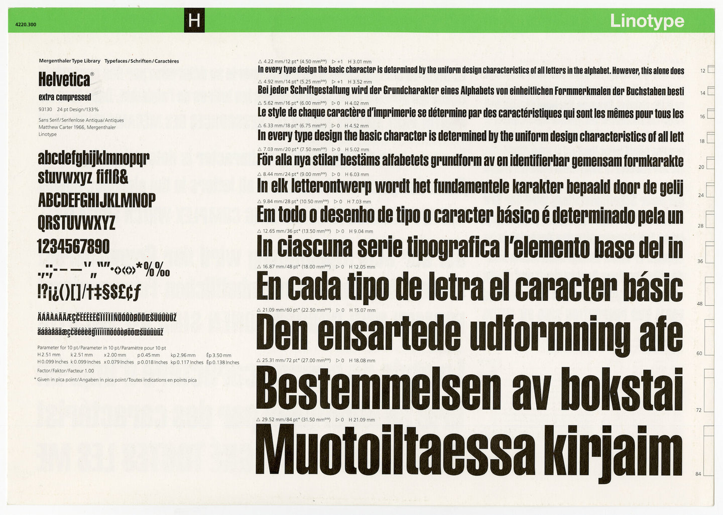 - opschriften: Mergenthaler Type Library Typefaces / Helvetica / extra compressed / 93130 24 pt Design/133% / Sans Serif / Matthew Carter 1966, Mergenthaler Linotype