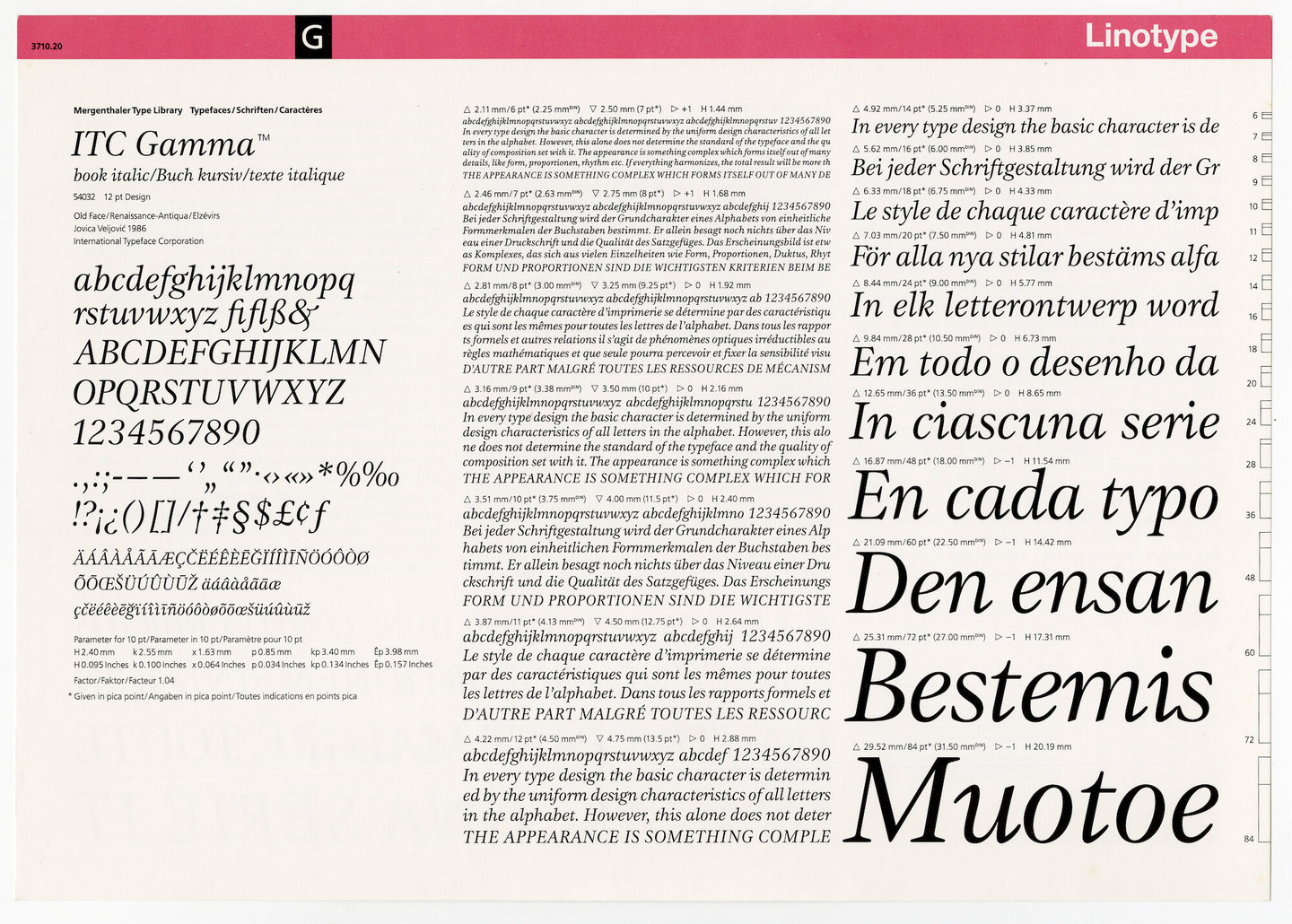 - opschriften: Mergenthaler Type Library Typefaces / ITC Gamma / book italic / 54032 12 pt Design / Old Face / Jovica Veljović 1986 / International Typeface Corporation