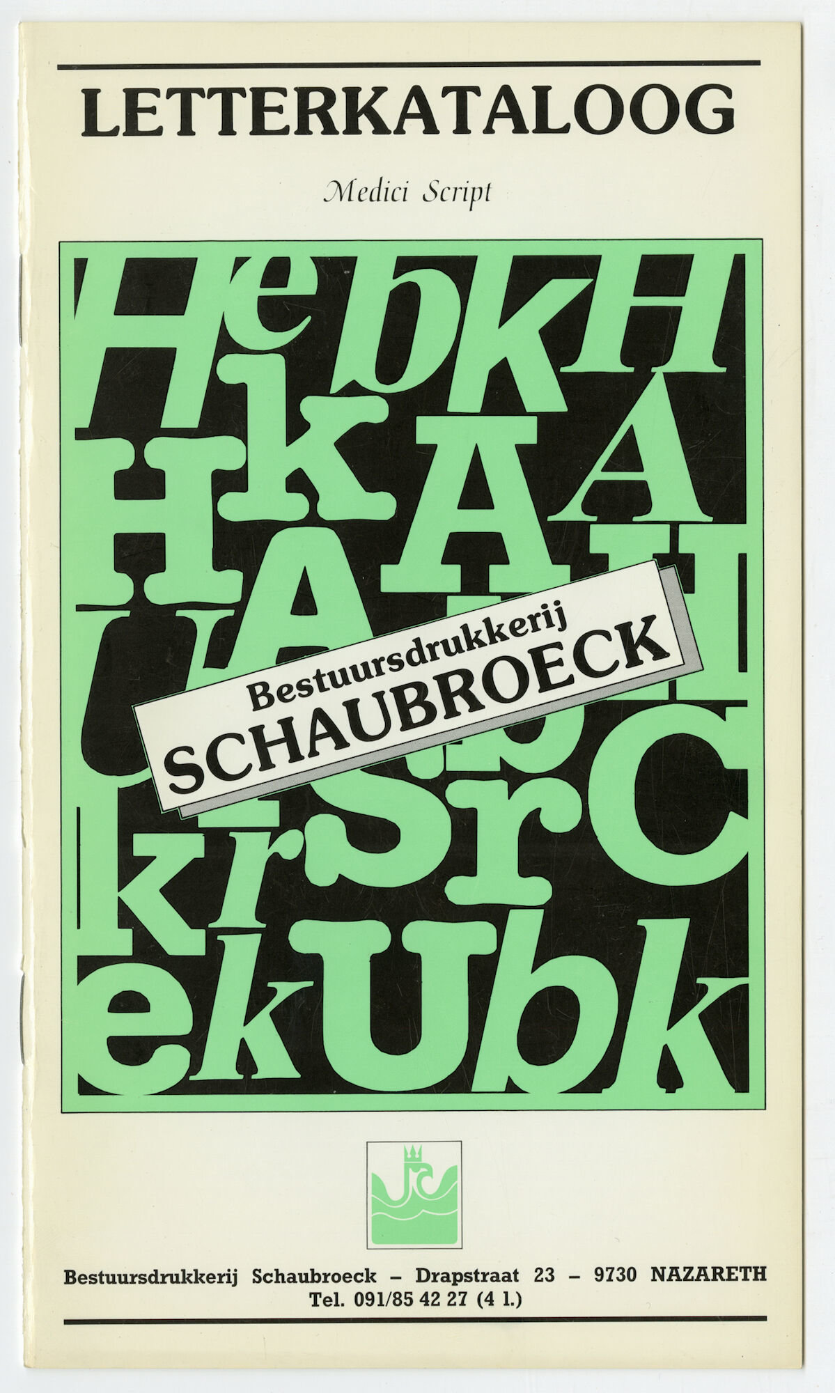 - opschriften: Letterkataloog Medici Script / Bestuursdrukkerij Schaubroeck / Drapstraat 23, 9730 Nazareth