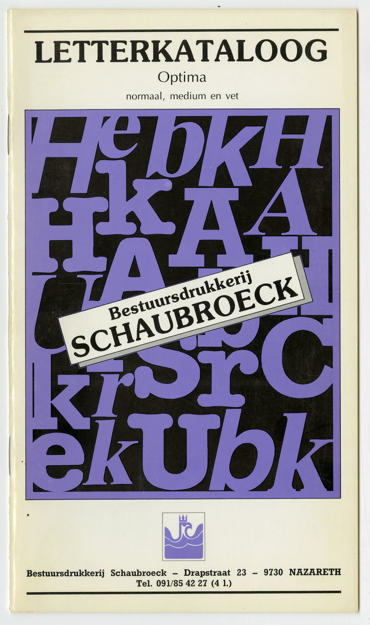 - opschriften: Letterkataloog Optima / normaal, medium en vet / Bestuursdrukkerij Schaubroeck / Drapstraat 23, 9730 Nazareth