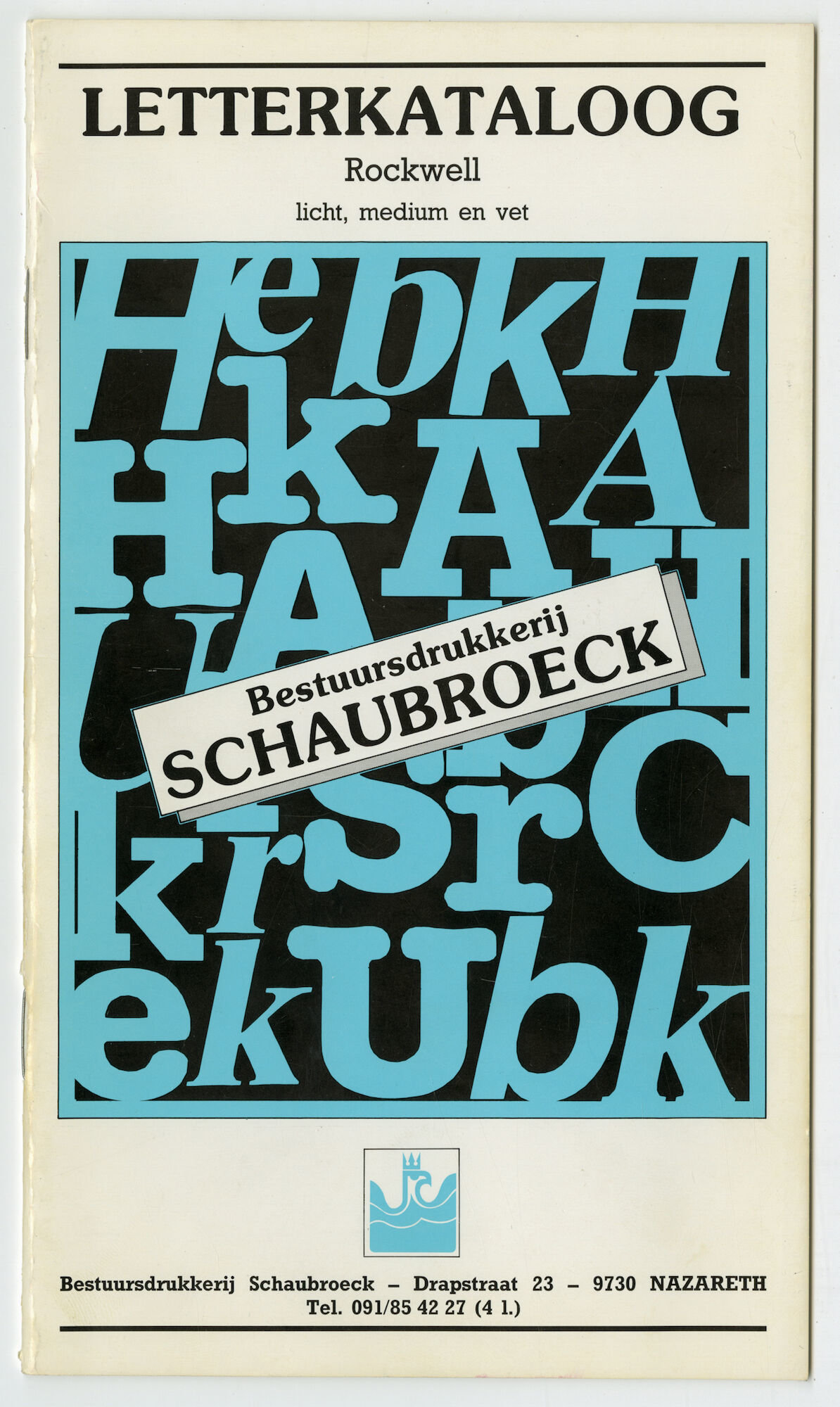 - opschriften: Letterkataloog Rockwell / licht, medium en vet / Bestuursdrukkerij Schaubroeck / Drapstraat 23, 9730 Nazareth