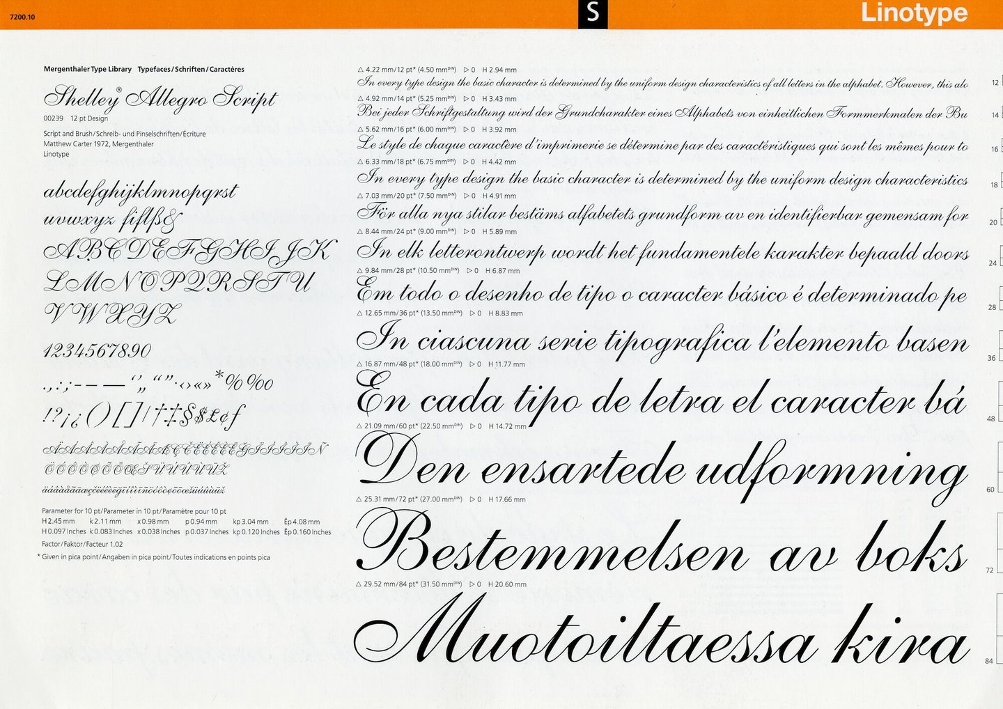 - opschriften: Mergenthaler Type Library Typefaces / Shelley Allegro Script / 00239 12pt Design / Script and Brush / Matthew Carter 1972, Mergenthaler / Linotype