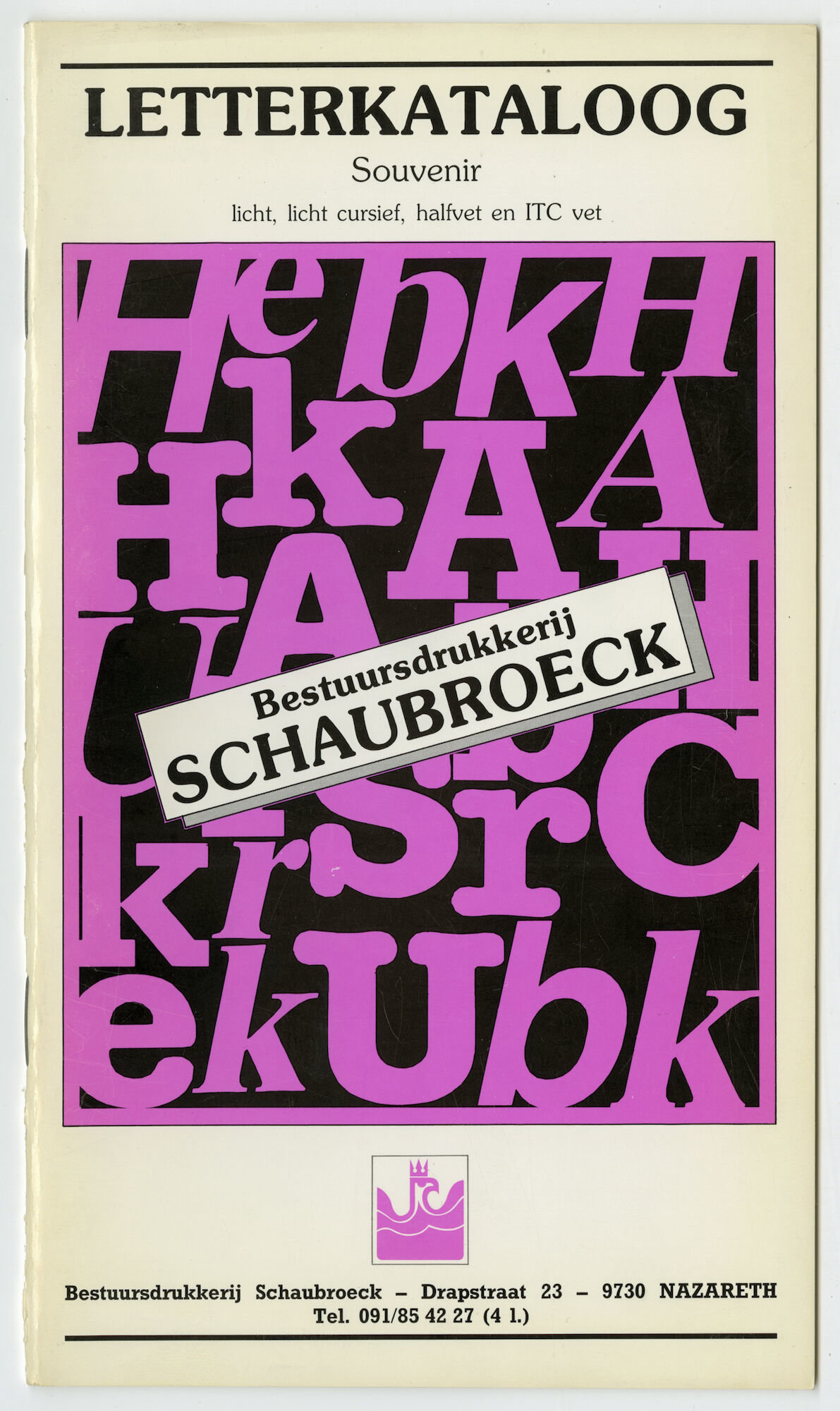 - opschriften: Letterkataloog Souvenir / licht, licht cursief, halfvet en ITC vet / Bestuursdrukkerij Schaubroeck / Drapstraat 23, 9730 Nazareth