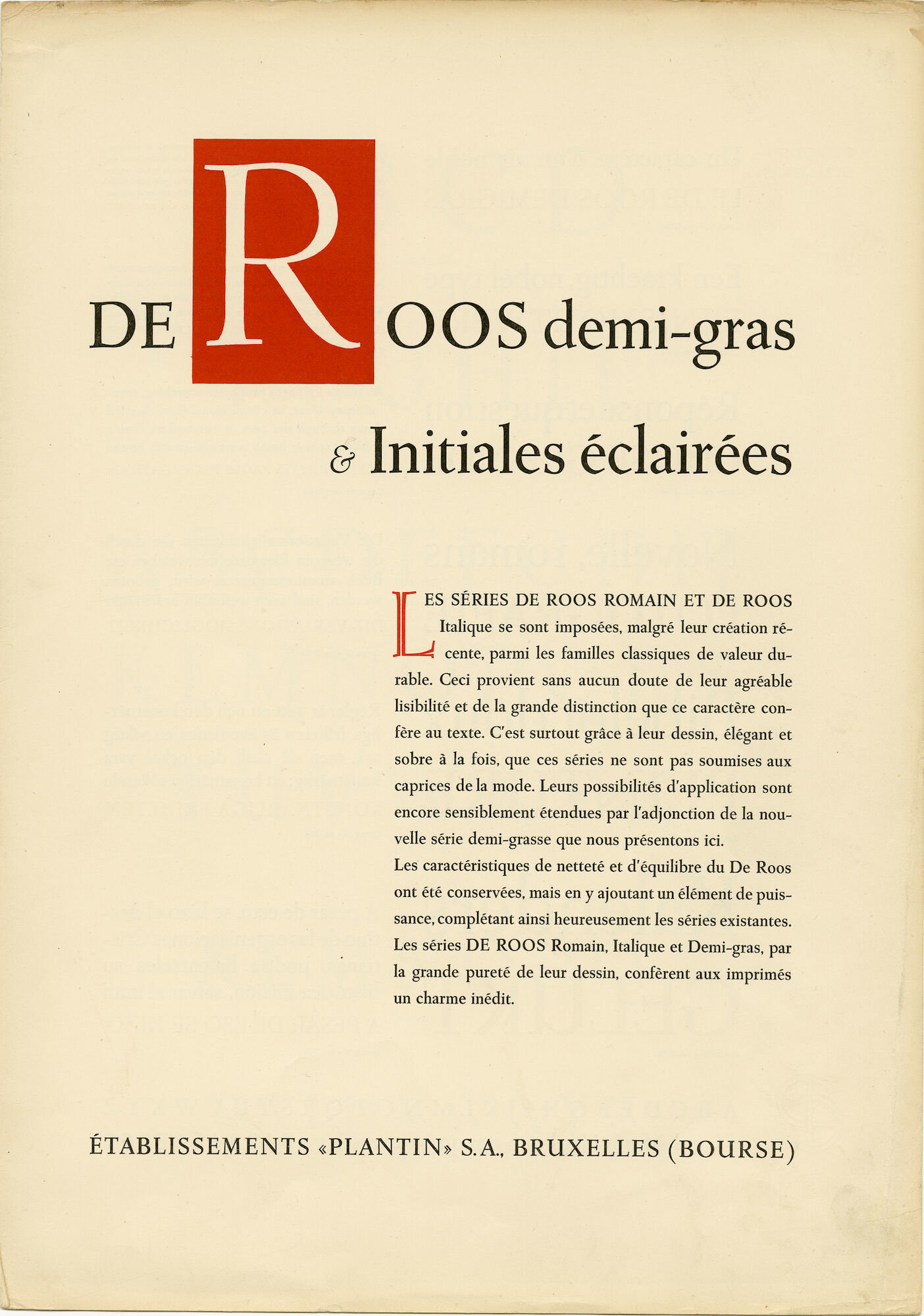 - opschriften: De Roos demi-gras et Initiales éclairées / Etablissements "Plantin" S.A. Bruxelles (Bourse)