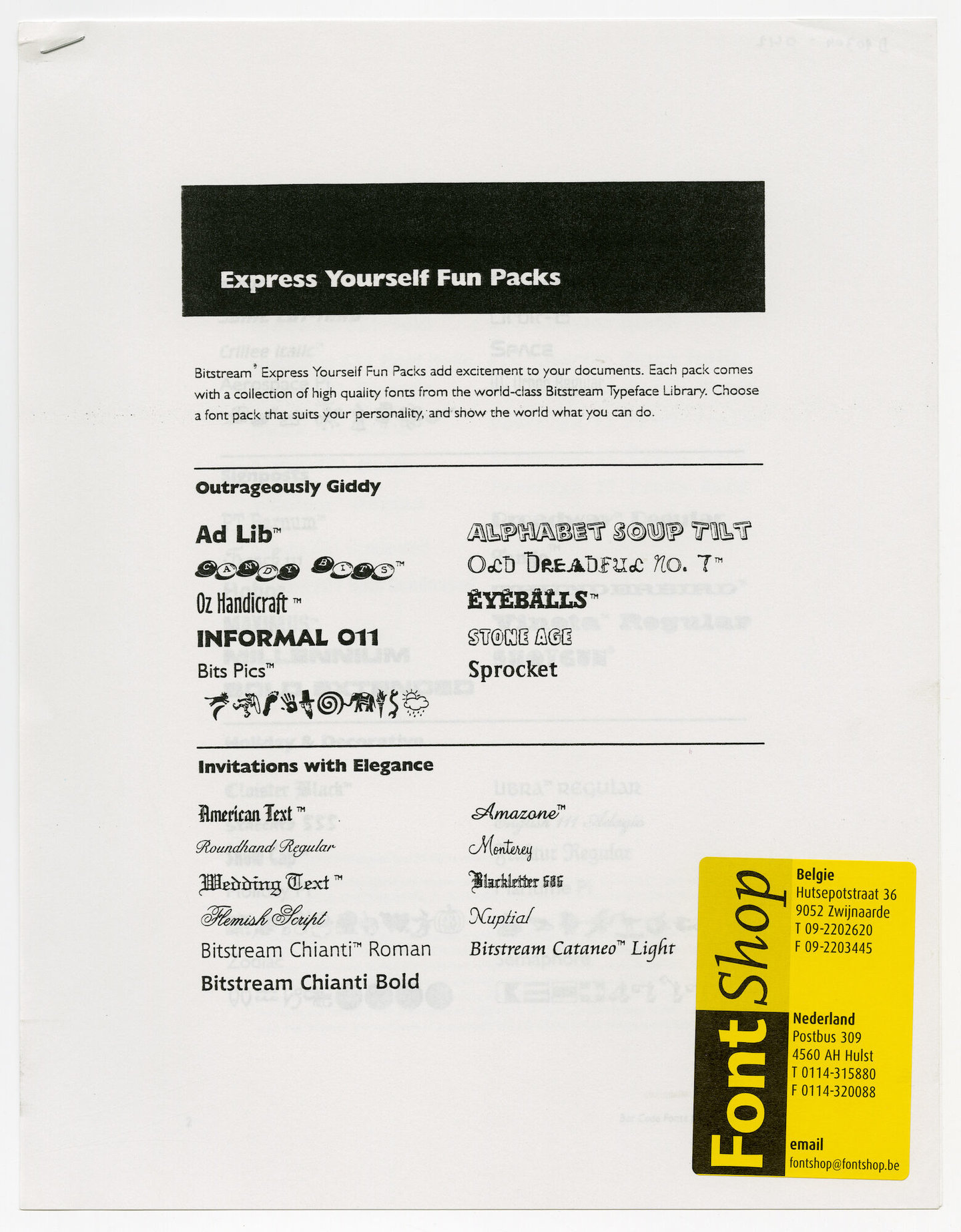 - opschriften: FontShop / België Hutsepotstraat 36, 9052 Zwijnaarde / Nederland Postbus 309, 4560 AH Hulst / email fontshop@fontshop.be