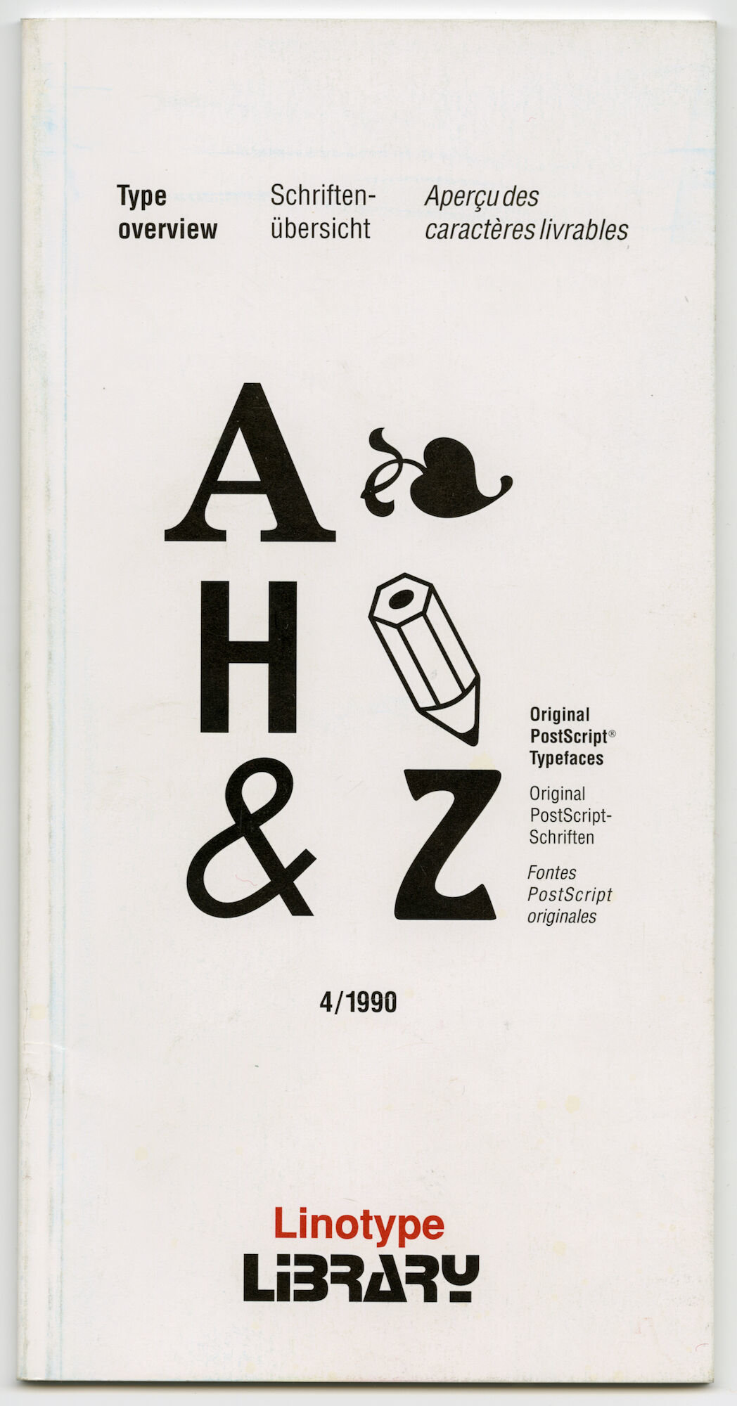 - opschriften: Type overview Schriftenübersicht Aperçu des caractères livrables / Original PostScript Typefaces Original PostScript Schriften Fontes PostScript originales / 4/1990 / Linotype Library