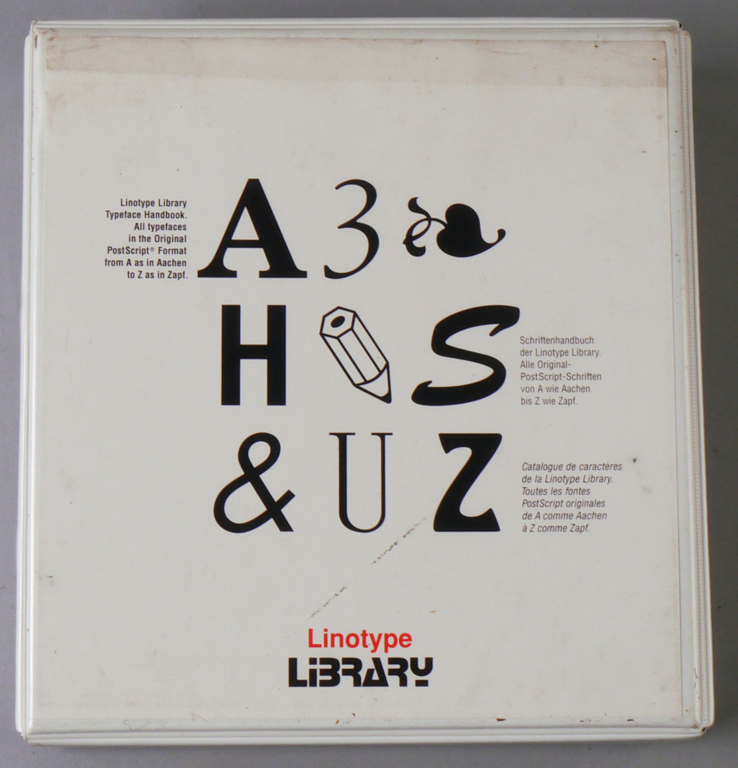- opschriften: Schriftenhandbuch der Linotype Library. Alle original-PostScript-Schriften von A wie Aachen bis Z wie Zapf / Catalogue de caractères de la Linotype Library. Toutes les fontes PostScript originales de A comme Aachen à Z comme Zapf.