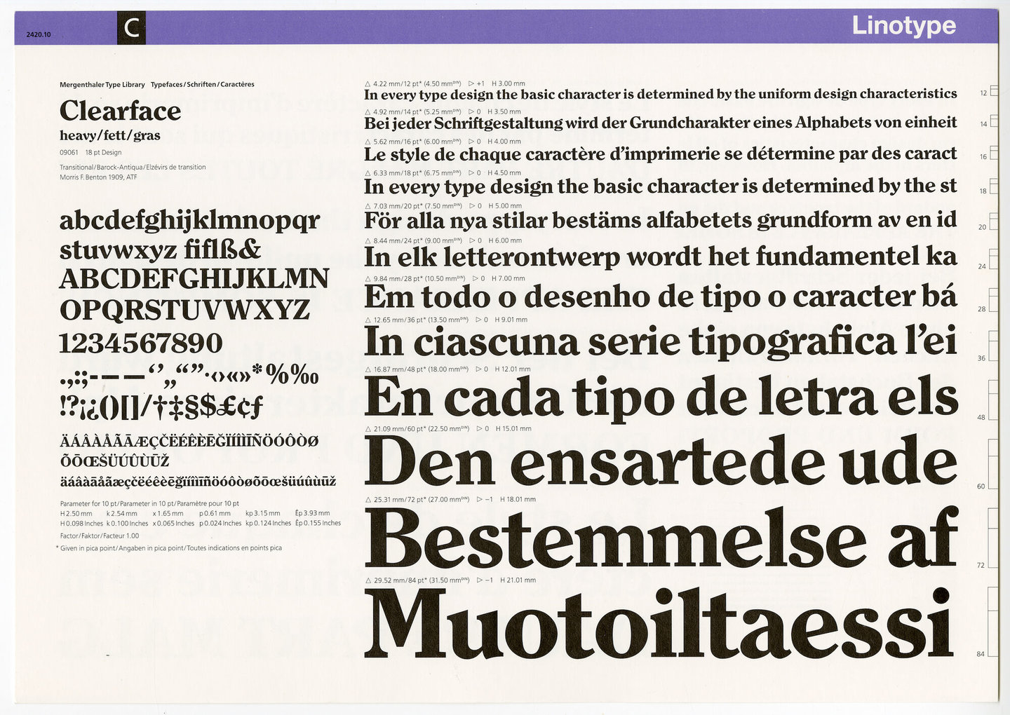 - opschriften: Mergenthaler Type Library Typefaces / Clearface / heavy / 09061 18 pt Design / Transitional / Morris F. Benton 1909, ATF