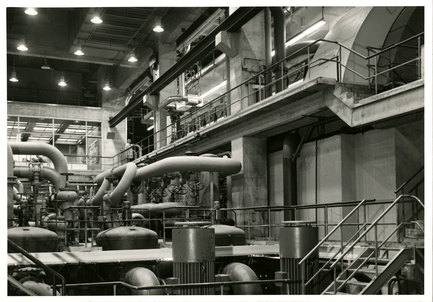 - opschriften: ACEC / Service VPV/RDO / PHOTOGRAPHIE / 119901 // Vue sur le hall intermédiaire. A droite, les circuits d' huile et d' eau de refroidissement du groupe diesel groupe / diesel K10SZ 105/180 type - alternateur