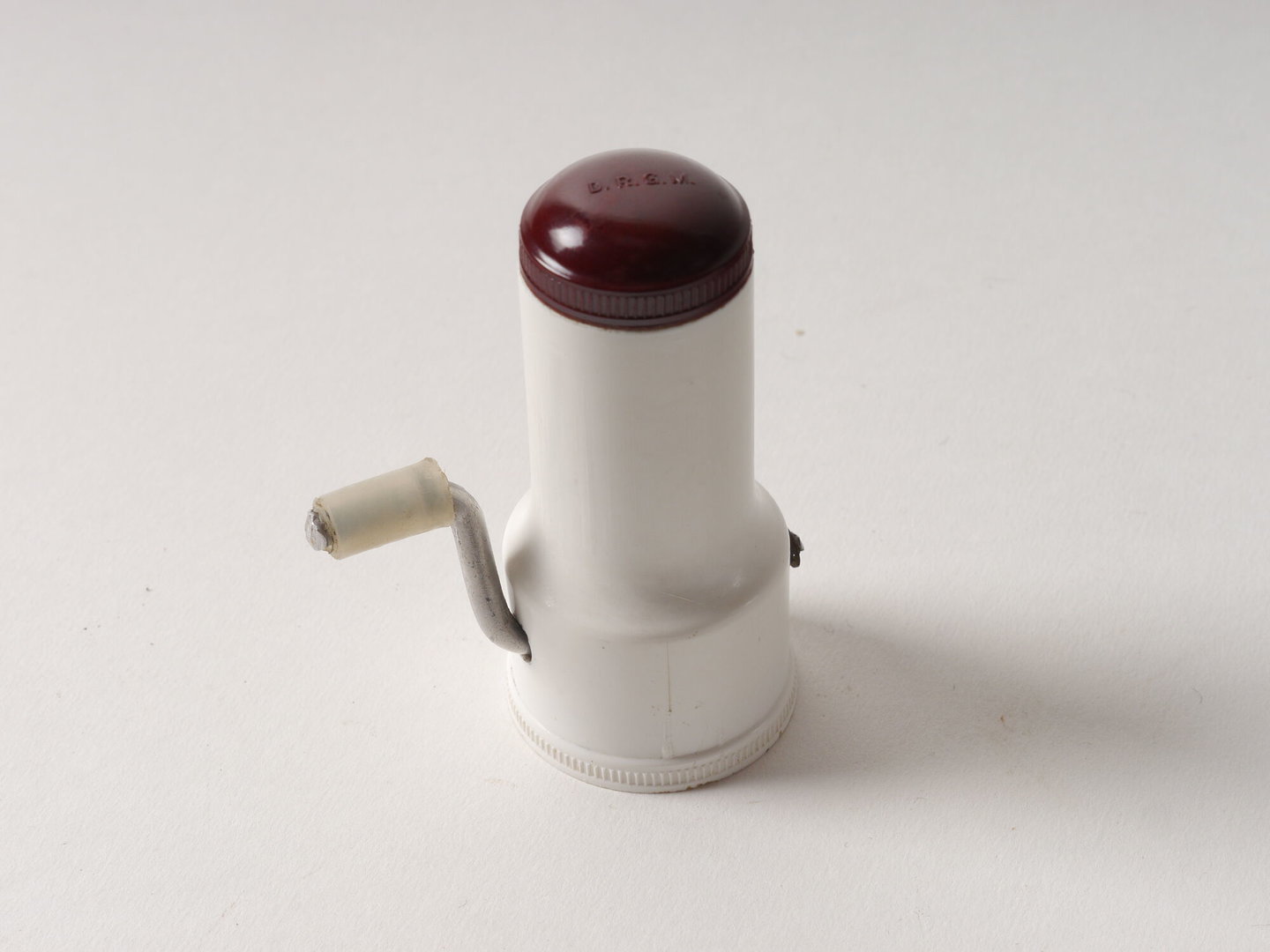 Molen met behuizing in witte kunststof, vermoedelijk melamine, en deksel in fenolhars (bakeliet).