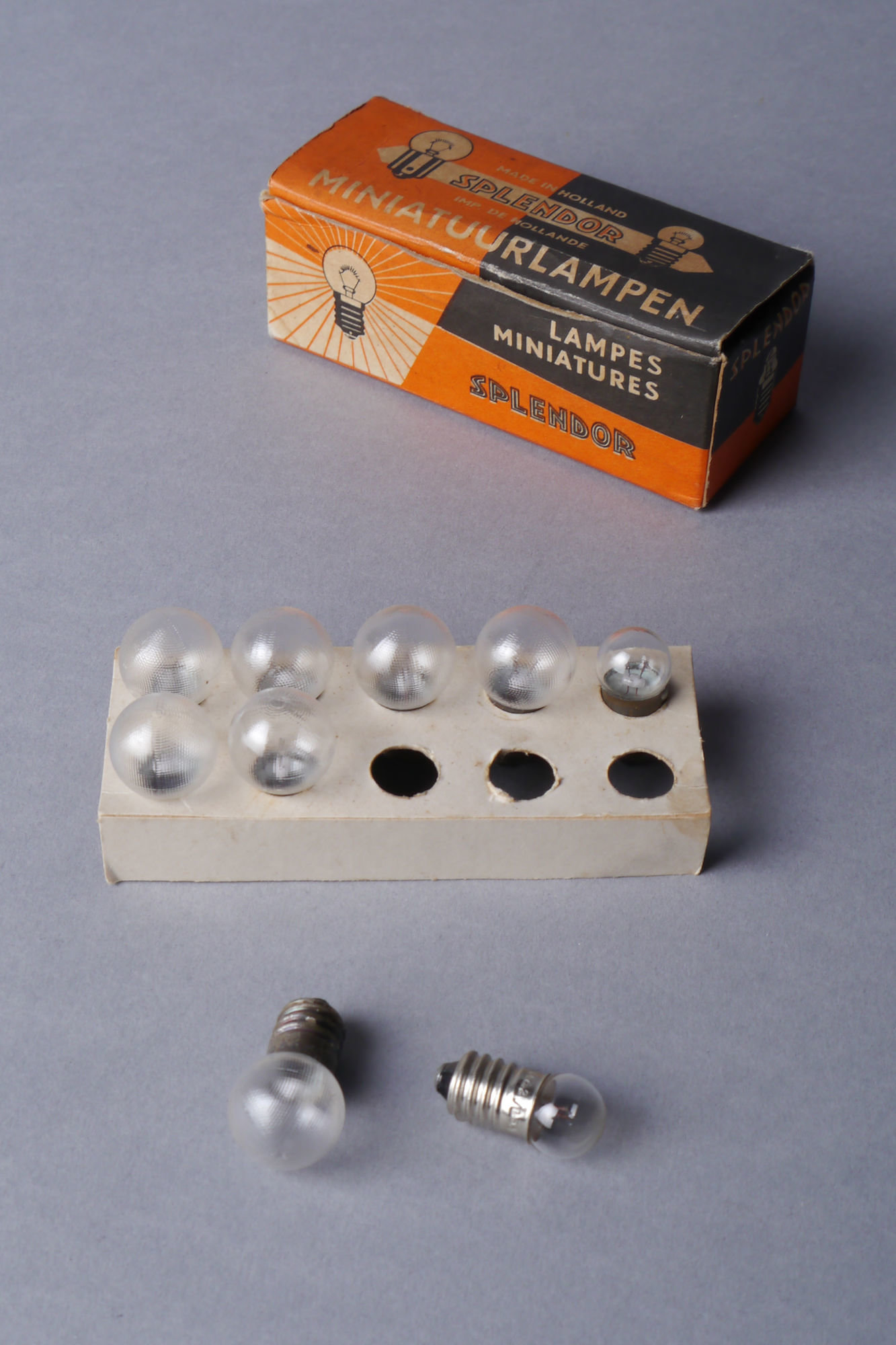 - opschriften: MADE IN HOLLAND / SPLENDOR / IMP. DE HOLLANDE / MINIATUURLAMPEN // 6 V 0.45 A / E 10 GRAN