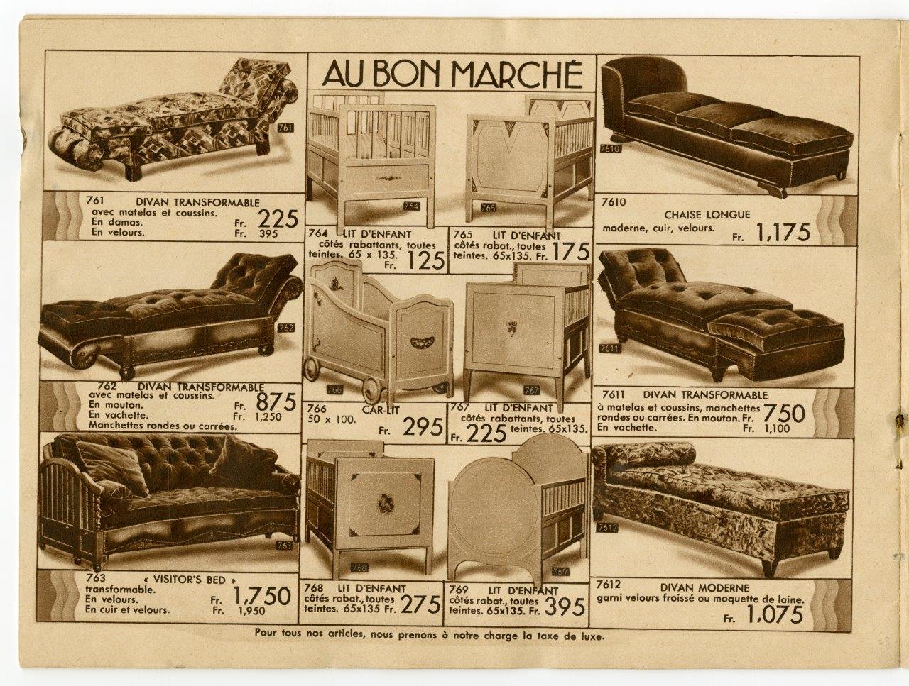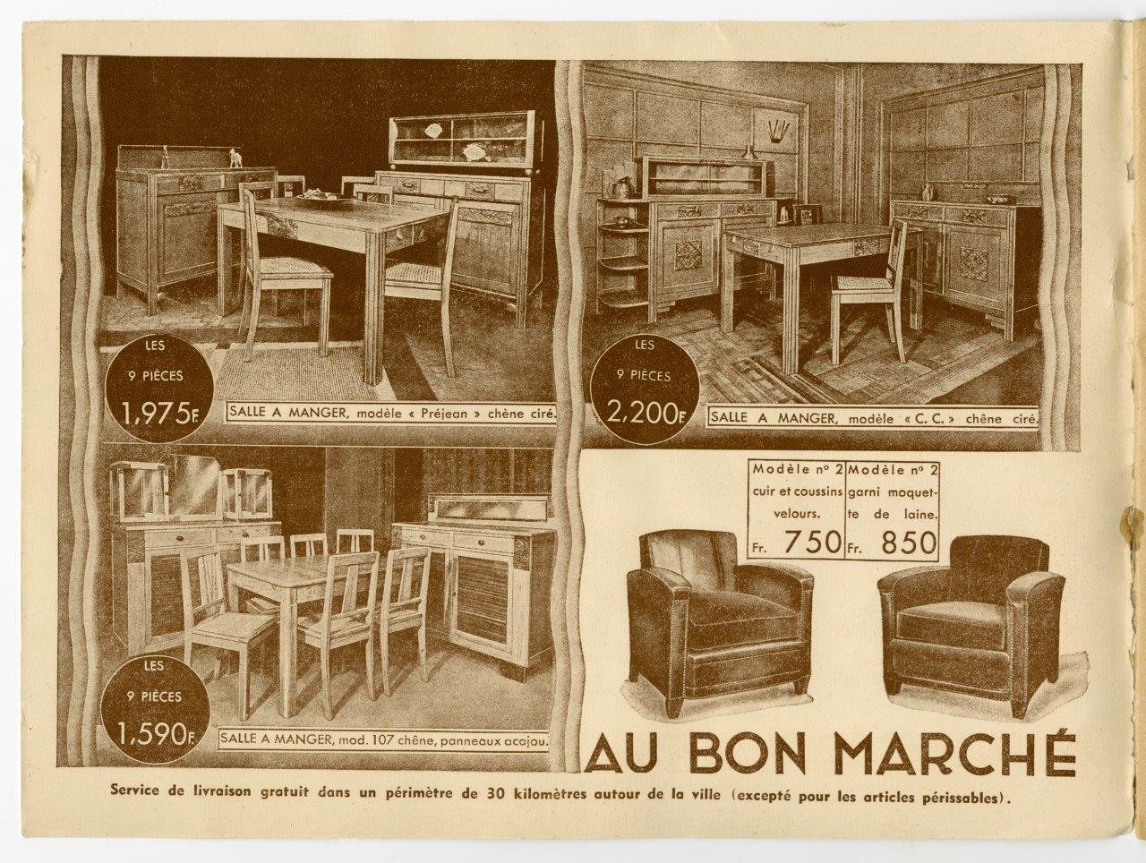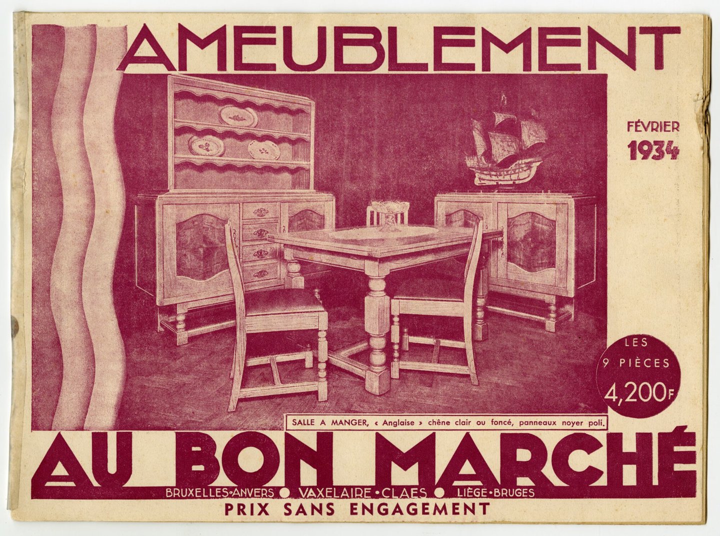 - opschriften: AMEUBLEMENT / FÉVRIER 1934 / AU BON MARCHÉ / BRUXELLES - ANVERS - VAXELAIRE - CLAES - LIÈGE - BRUGES