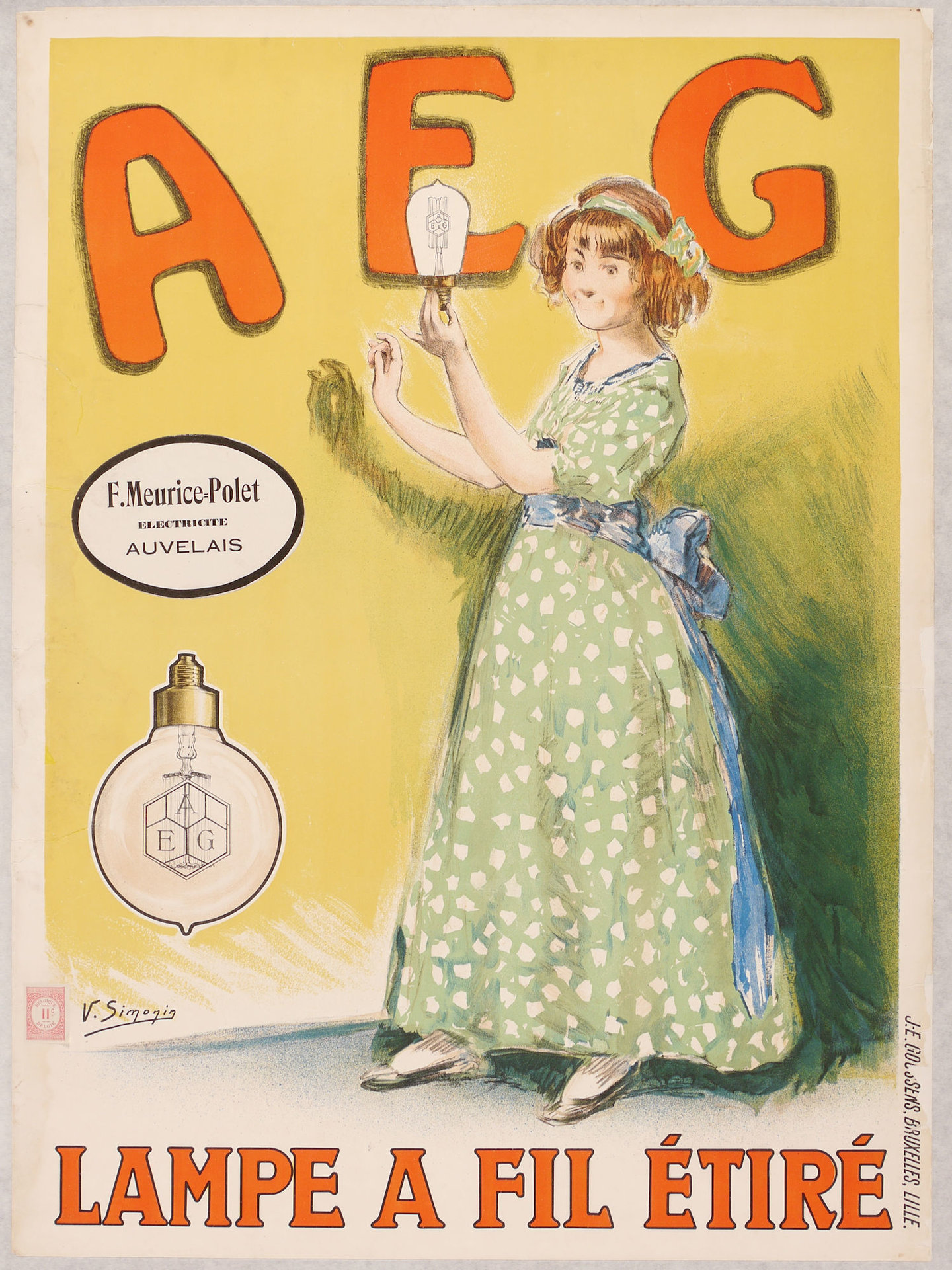 - opschriften: AEG / F. Meurice-Polet / ELECTRICITE / AUVELAIS / AEG / V. Simonin / LAMPE A FIL ÉTIRÉ / J.E.GOOSSENS, BRUXELLES, LILLE.