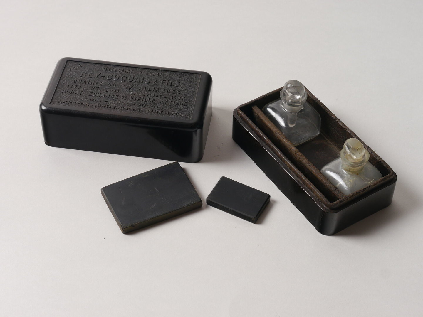 - opschriften: DÉPOSÉ NÉCESSAIRE D'ESSAI REY-COQUAIS & FILS CHAINES OR ALLIANCES LYON - 27, QUAI St. ANTOINE _ LYON ACHAT _ ÉCHANGE DE VIEILLE MATIÈRE ANALYSES - ESSAIS - AFFINNAGE G. REY-COQUAIS ESSAYEUR DIPLOMÉ DE LA MONNAIE DE PARIS