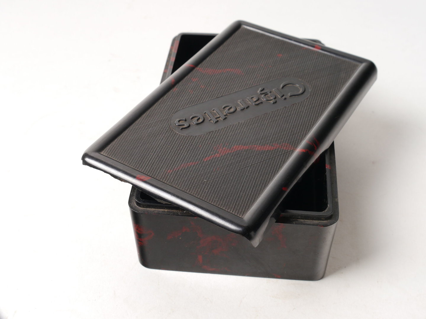 Doos met afneembaar deksel in fenolhars (bakeliet) om sigaretten in op te bergen. Geproduceerd door Vynckier Frères & Compagnie SA in Gent.