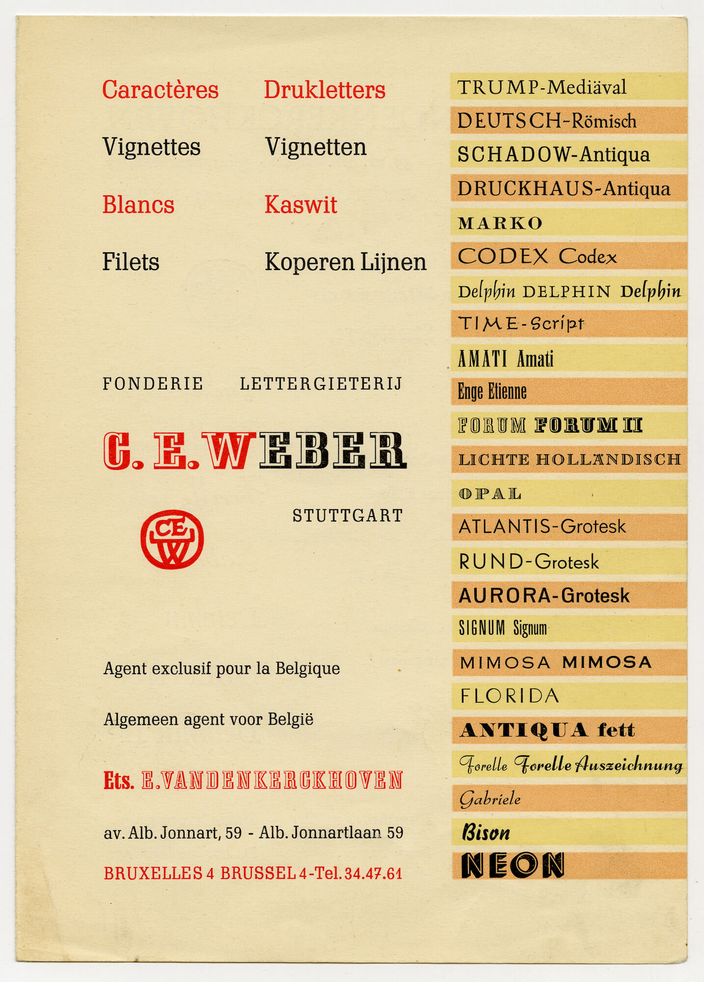 - opschriften: Caractères Drukletters / Vignettes Vignetten / Blancs Kaswit / Filets Koperen Lijnen / Fonderie Lettergieterij C.E. Weber Stuttgart / Algemeen agent voor België Ets. E. Vandenkerckhoven / Alb. Jonnartlaan 59, Brussel 4 - Tel. 34.47.61