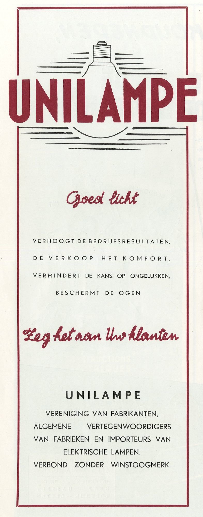 - opschriften: UNILAMPE / Goed licht / Zeg het aan uw klanten / Unilampe