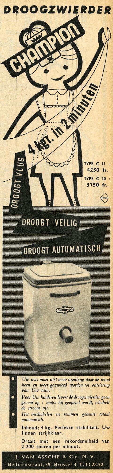 Advertentie voor wasdrogers met staande centrifuge van het merk Champion, type C11 (verkocht aan 4250 BF) en type C10 (verkocht aan 3750 BF). Verdeeld door J. Van Assche & Cie NV te Brussel.