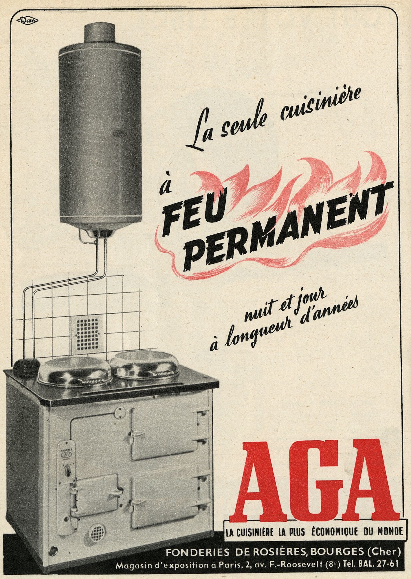 #wonen #publiciteit #informatie en communicatie #3de kwart 20ste eeuw #koken #verwarmen #kooktoestellen #keuken #fornuis #toestellen op kolen #warmwatertoestellen #boiler #Fonderies de Rosières #AGA