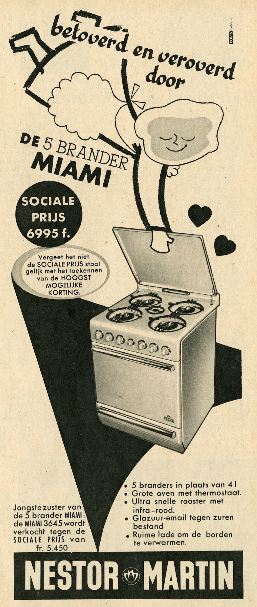 Advertentie voor gasfornuis met 5 branders, oven met infrarood grill en bordenwarmer. Van het merk Nestor Martin, type Miami 645. Verkocht tegen de sociale prijs van 6995 BF.