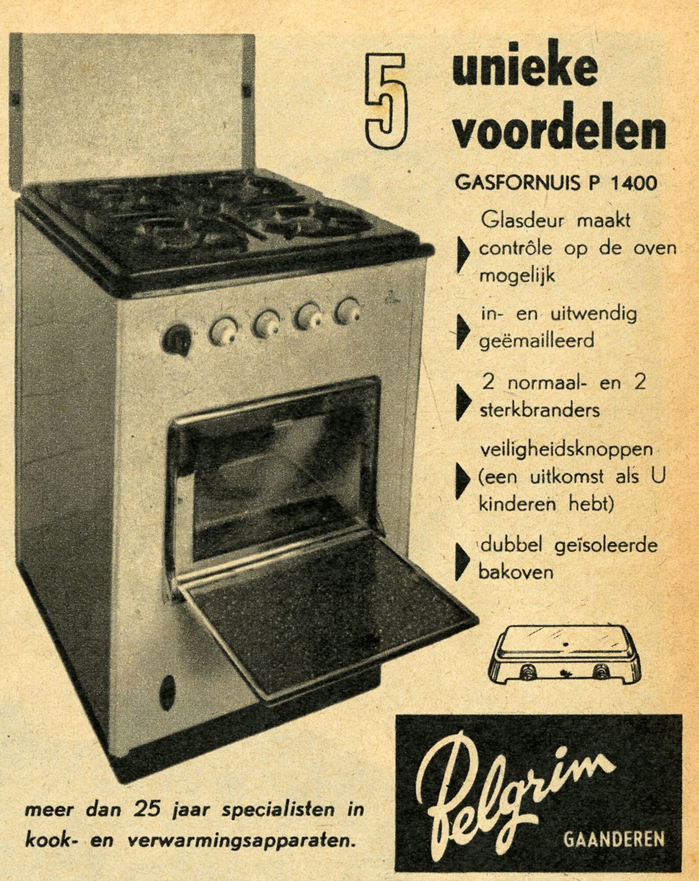 Slogan: Pelgrim, meer dan 25 jaar specialisten in kook- en verwarmingsapparaten.