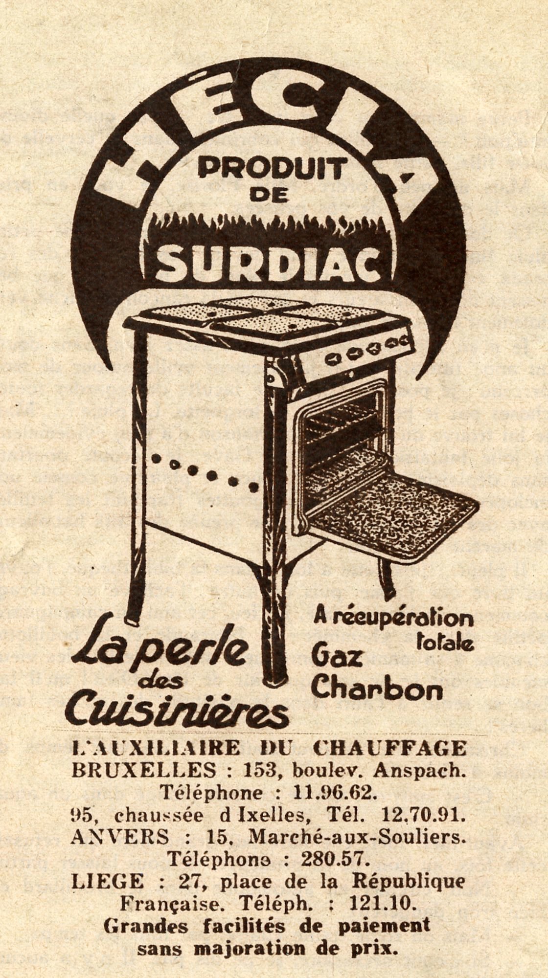 Advertentie voor fornuis met 4 kookplaten en oven. Van het merk Surdiac, type Hécla. Bestaat in een versie op gas en een versie op steenkool.