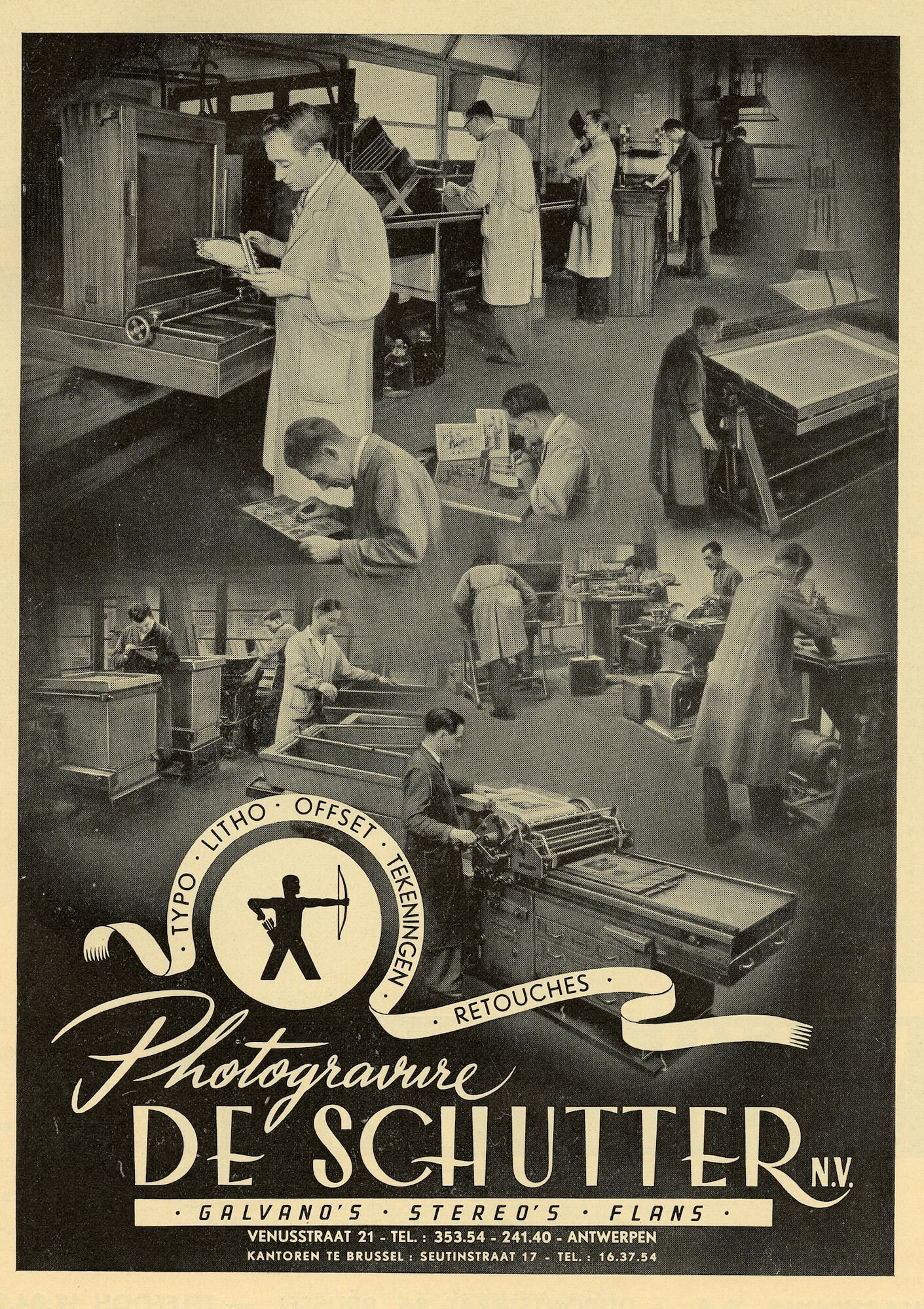 Advertentie van het grafisch bedrijf Photogravure De Schutter NV gevestigd te Antwerpen. De fotogravure produceert drukvormen, zoals galvano's, stereo's en flans in opdracht van drukkers.