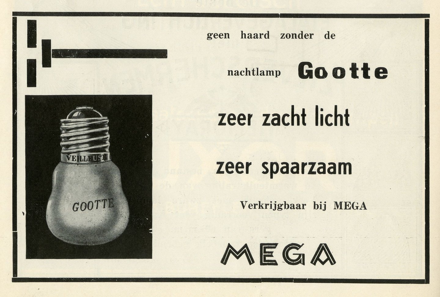 - opschriften: geen haard zonder de / nachtlamp Gootte / zeer zacht licht / zeer spaarzaam / verkrijgbaar bij MEGA / MEGA / VEILLEUSE / GOOTTE