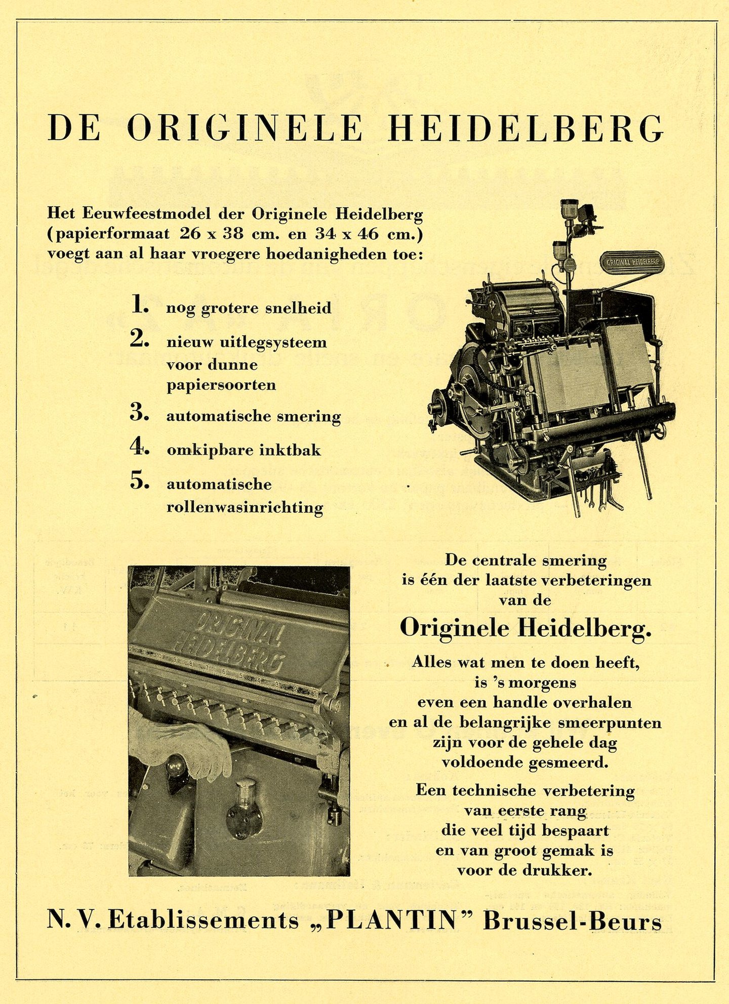 Reclame voor Heidelberg degelpers verdeeld door Plantin