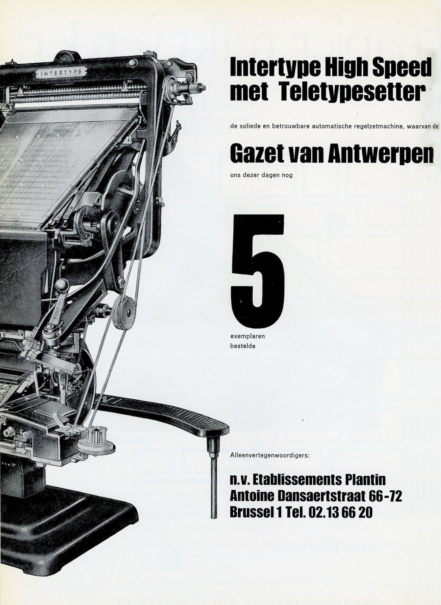 Advertentie voor de regelzetmachine Intertype High Speed met Teletypesetter, verdeeld door Etablissements Plantin NV gevestigd in de Antoine Dansaertstraat te Brussel. De Teletypesetter apparatuur zorgt ervoor dat de zetmachine kan worden aangestuurd door een ponsband. De ponsband wordt door een aparte ponsmachine met toetsenbord geperforeerd.