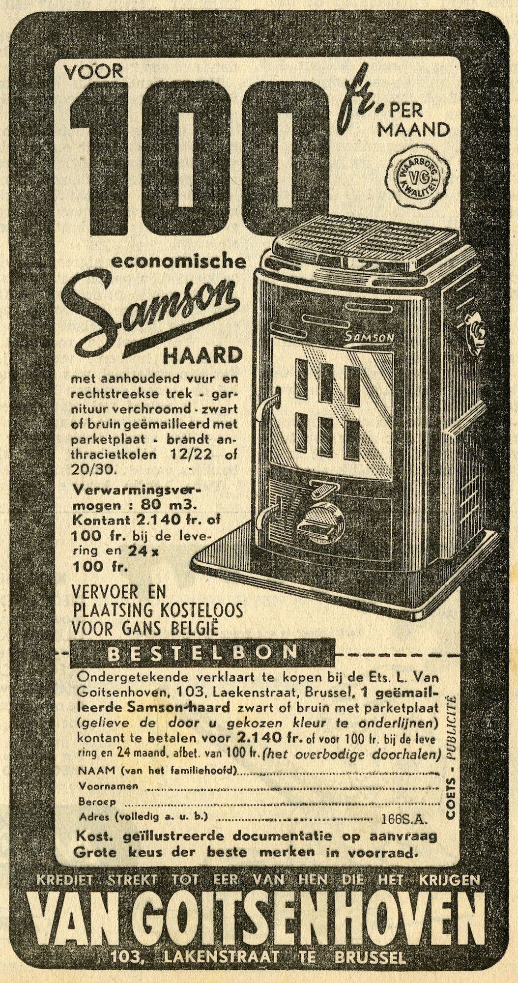 Advertentie voor de aankoop van een geëmailleerde Samson haard op afbetaling bij Van Goitsenhoven (Brussel) aan 100 BF per maand.