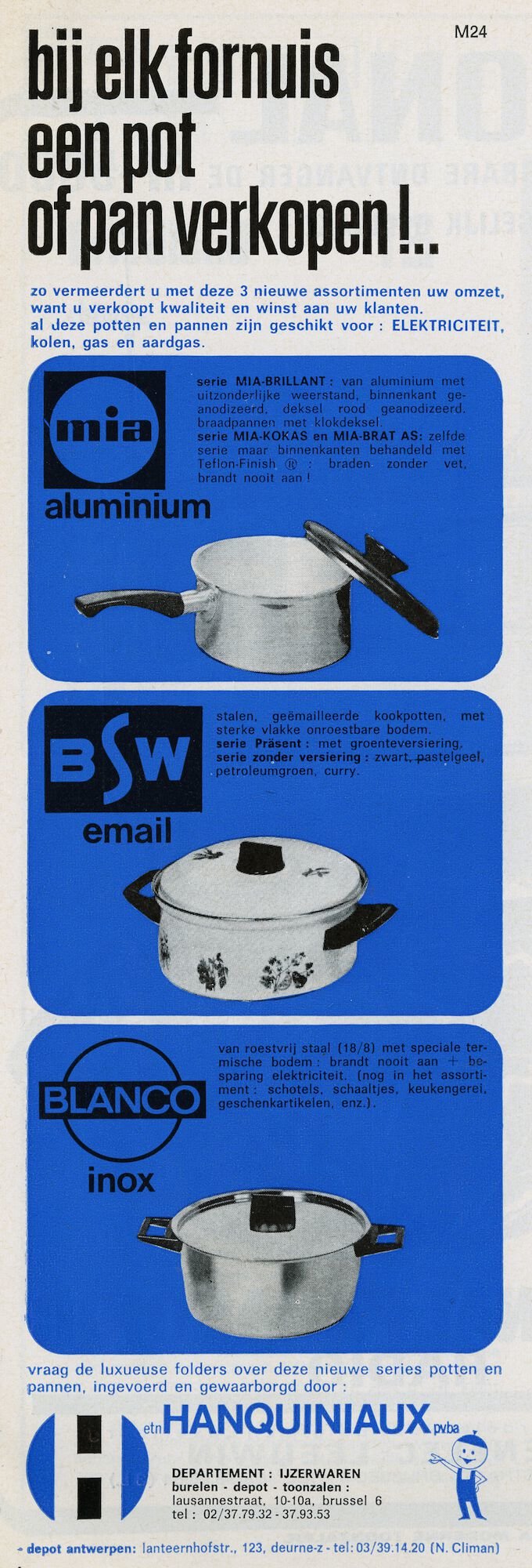 Advertentie voor kookpotten van: Mia, aluminium: binnenkant behandeld met Teflon finish (type Mia kokas en Mia brat AS); BSW, email: stalen, geëmailleerde kookpot met sterke vlakke onroestbare bodem (serie Präsent: met groenteversiering); Blanco, inox: van roestvrij staal (18/8) met speciale thermische bodem. Verdeeld door Hanquiniaux PVBA te Brussel.
