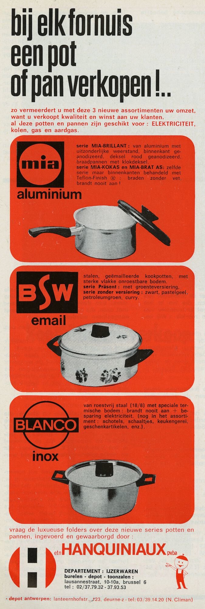 Advertentie voor kookpotten van: Mia, aluminium: binnenkant behandeld met Teflon finish (type Mia kokas en Mia brat AS); BSW, email: stalen, geëmailleerde kookpot met sterke vlakke onroestbare bodem (serie Präsent: met groenteversiering); Blanco, inox: van roestvrij staal (18/8) met speciale thermische bodem. Verdeeld door Hanquiniaux PVBA te Brussel.