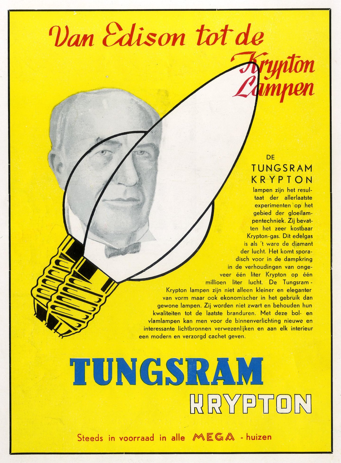 - opschriften: Van Edison tot de / Krypton / Lampen / TUNGSRAM / KRYPTON