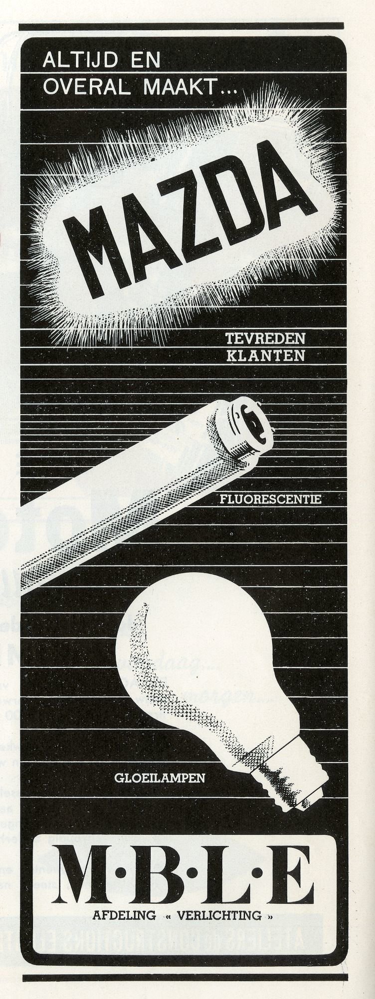 - opschriften: ALTIJD EN / OVERAL MAAKT / MAZDA / MBLE / AFDELING VERLICHTING
