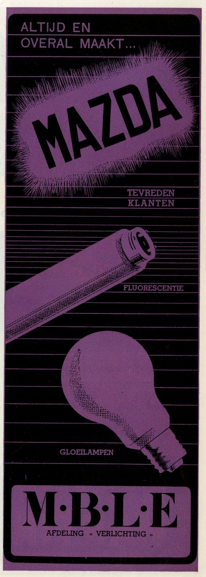 - opschriften: ALTIJD EN / OVERAL MAAKT / MAZDA / MBLE / AFDELING VERLICHTING