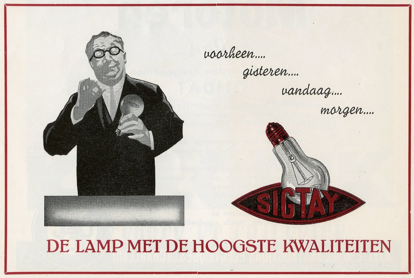 - opschriften: voorheen... / gisteren... / vandaag... / morgen... / DE LAMP MET DE HOOGSTE KWALITEIT