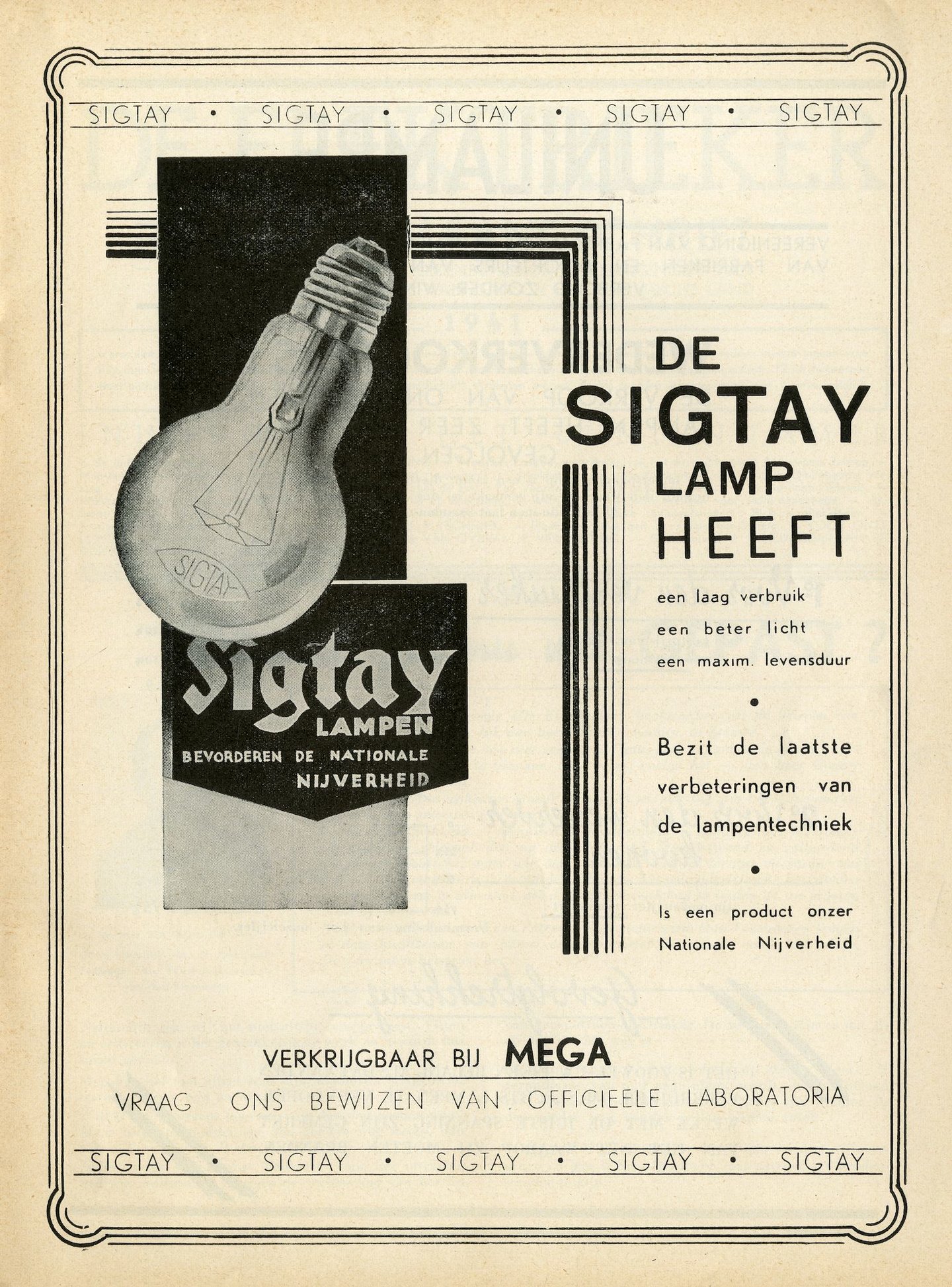 - opschriften: SIGTAY / DE / SIGTAY / LAMP / HEEFT / een laag verbruik / een beter licht / een maxim. Levensduur / Bezit de laatste verbeteringen van de lampentechniek / Is een product onzer / Nationale Nijverheid / VERKRIJGBAAR BIJ MEGA / VRAAG ONS BEWIJZEN VAN OFFICIE
